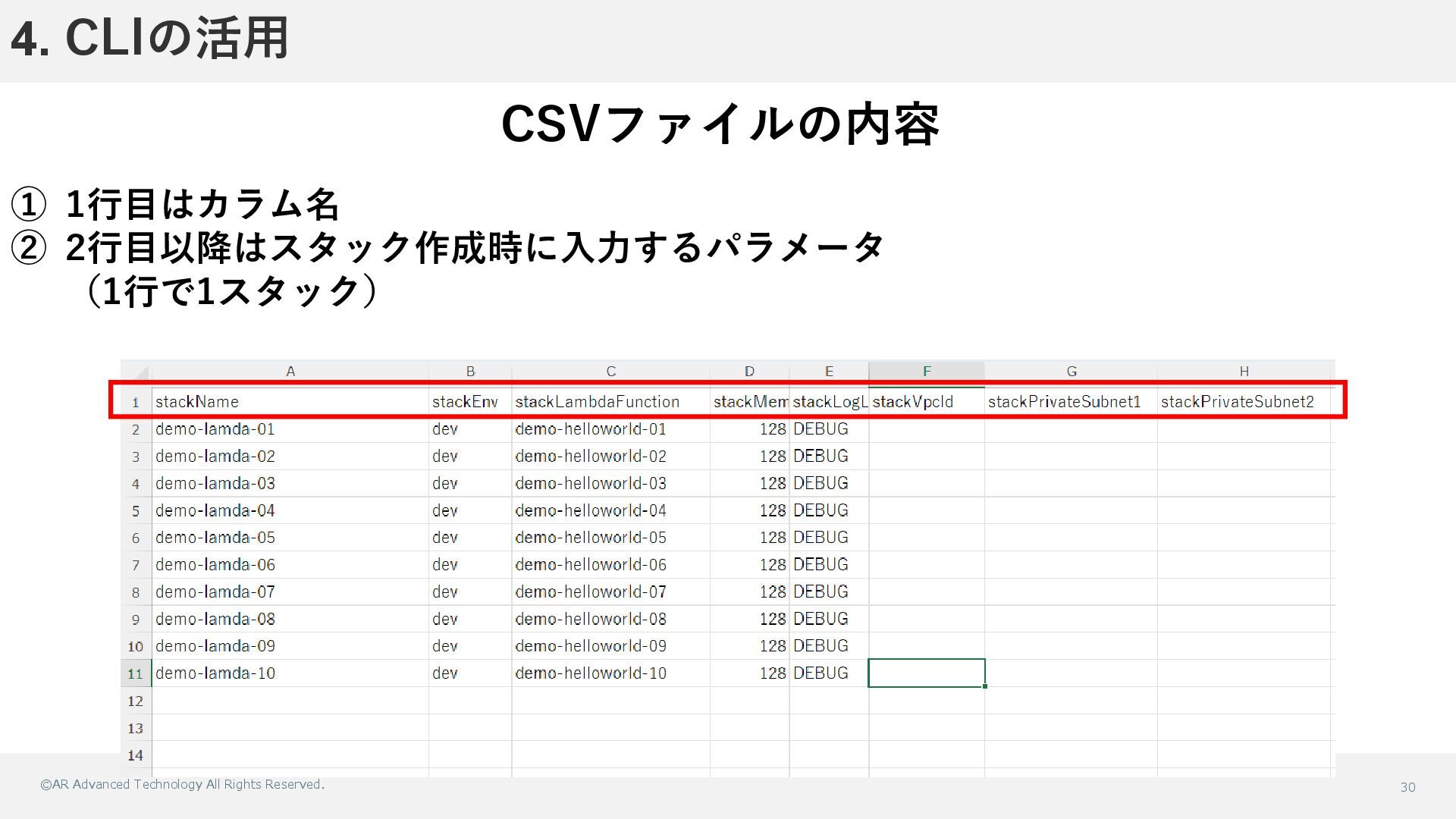 2行目以降はスタック作成時に入力するパラメータ (1行で1スタック) 4. CLIの活用 CSVファイルの内容