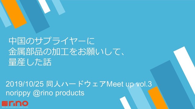 中国のサプライヤーに ⾦属部品の加⼯をお願いして、 量産した話 2019/10/25 同人ハードウェアMeet up vol.3 norippy @rino products
