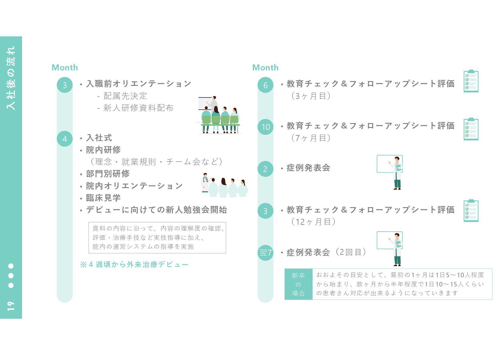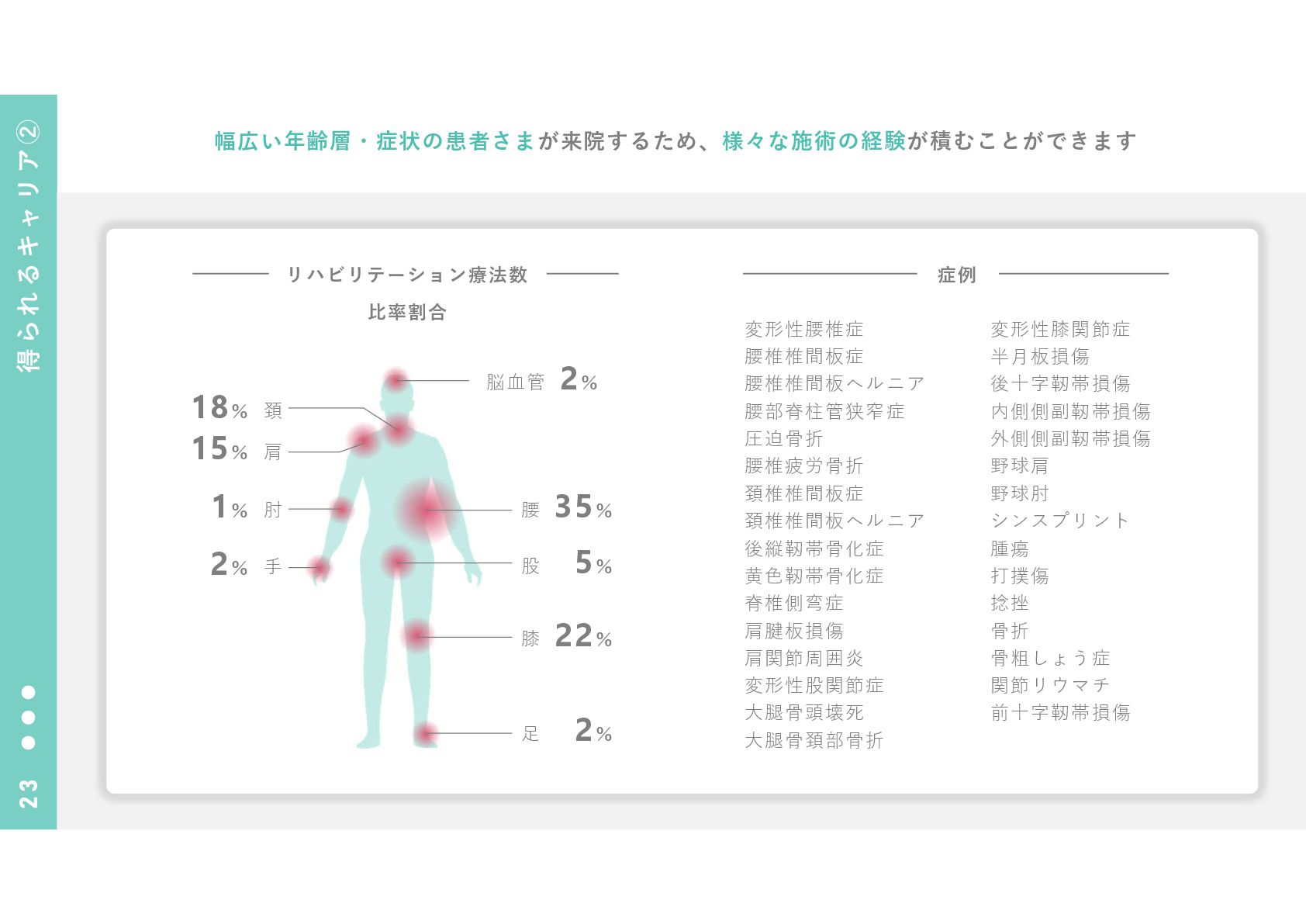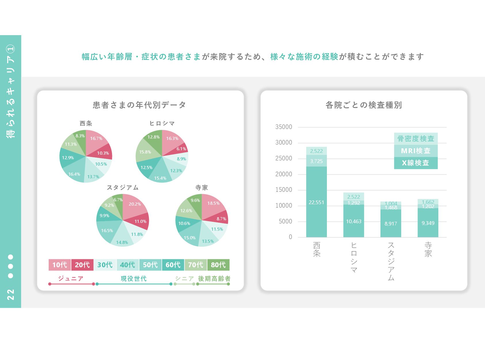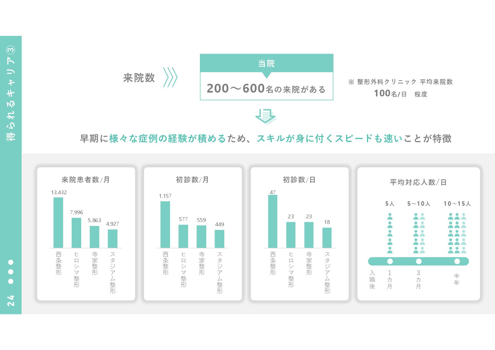 来院数 早期に様々な症例の経験が積めるため、スキルが身に付くスピードも速いことが特徴 平均対応人数/日 入 職 後 13,432 7,996 5,863 4,927 西 条 整 形 ヒ ロ シ マ 整 形 寺 家 整 形 ス タ ジ ア ム 整 形 来院患者数/月 1,157 577 559 449 西 条 整 形 ヒ ロ シ マ 整 形 寺 家 整 形 ス タ ジ ア ム 整 形 初診数/月 47 23 23 18 西 条 整 形 ヒ ロ シ マ 整 形 寺 家 整 形 ス タ ジ ア ム 整 形 初診数/日 当院 200~600名の来院がある 1 カ 月 3 カ 月 半 年 5人 5~10人 10~15人 ※ 整形外科クリニック 平均来院数 100名/日 程度