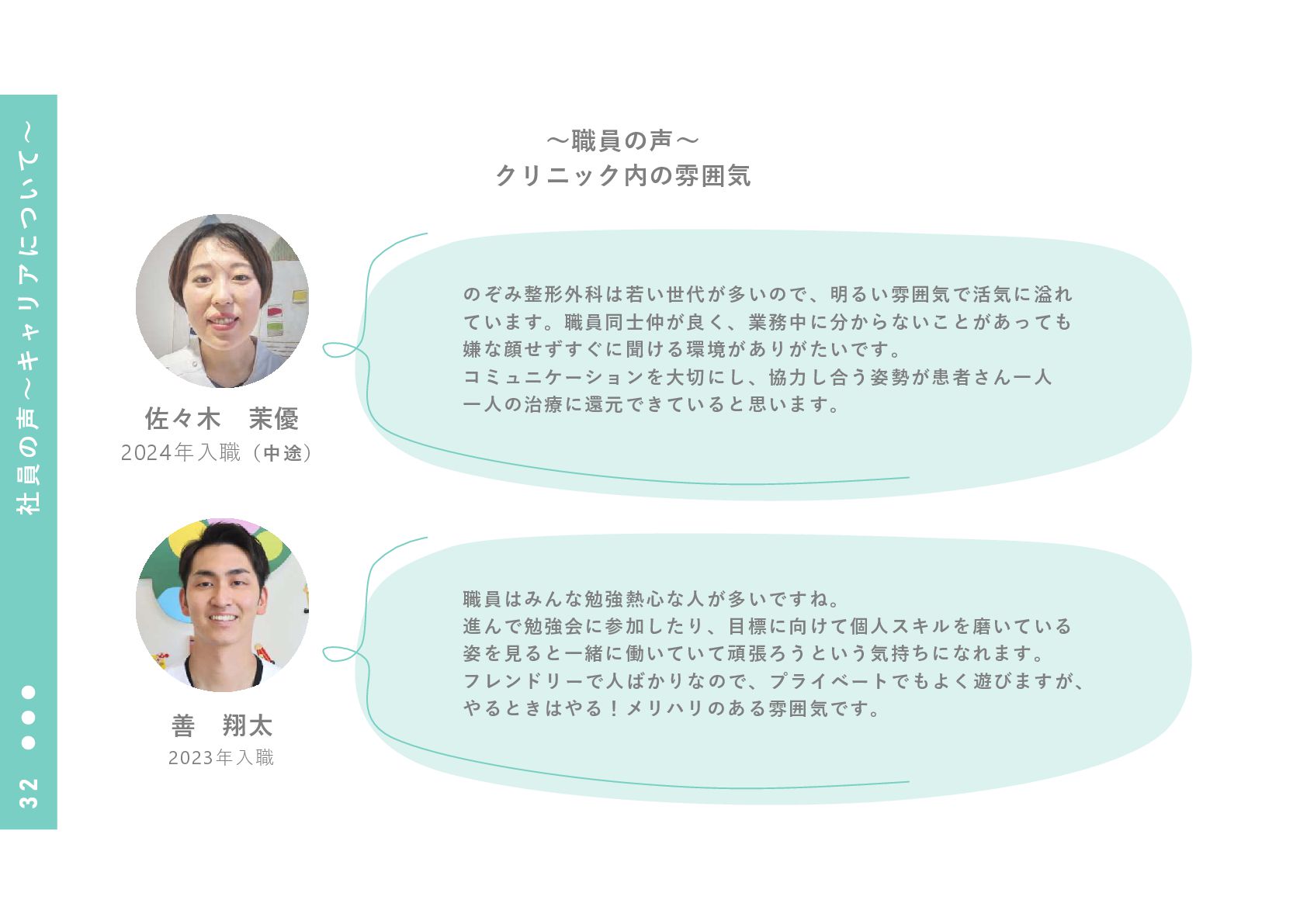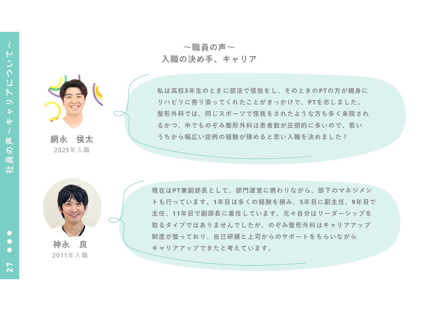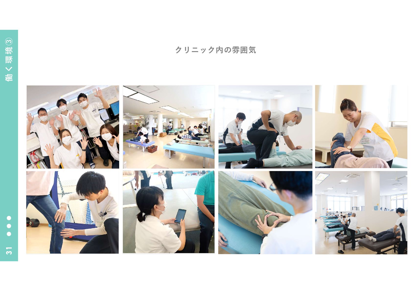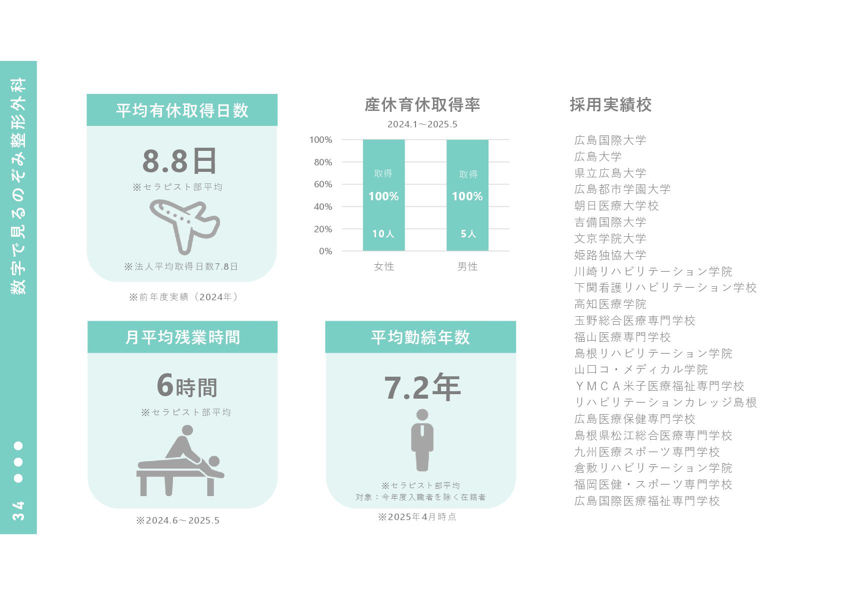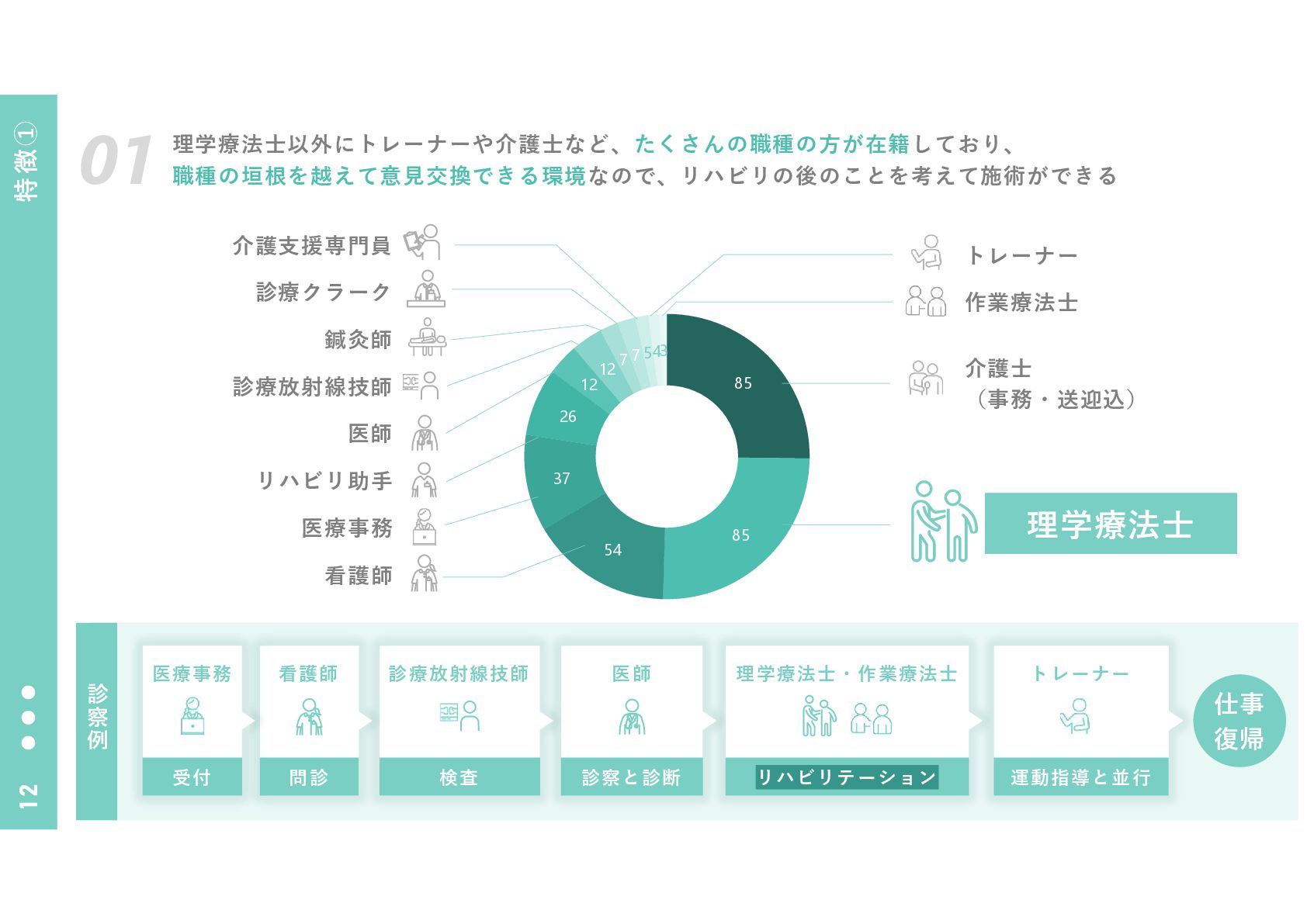来院数 早期に様々な症例の経験が積めるため、スキルが身に付くスピードも速いことが特徴 平均対応人数/日 入 職 後 13,432 7,996 5,863 4,927 西 条 整 形 ヒ ロ シ マ 整 形 寺 家 整 形 ス タ ジ ア ム 整 形 来院患者数/月 1,157 577 559 449 西 条 整 形 ヒ ロ シ マ 整 形 寺 家 整 形 ス タ ジ ア ム 整 形 初診数/月 47 23 23 18 西 条 整 形 ヒ ロ シ マ 整 形 寺 家 整 形 ス タ ジ ア ム 整 形 初診数/日 当院 200~600名の来院がある 1 カ 月 3 カ 月 半 年 5人 5~10人 10~15人 ※ 整形外科クリニック 平均来院数 100名/日 程度