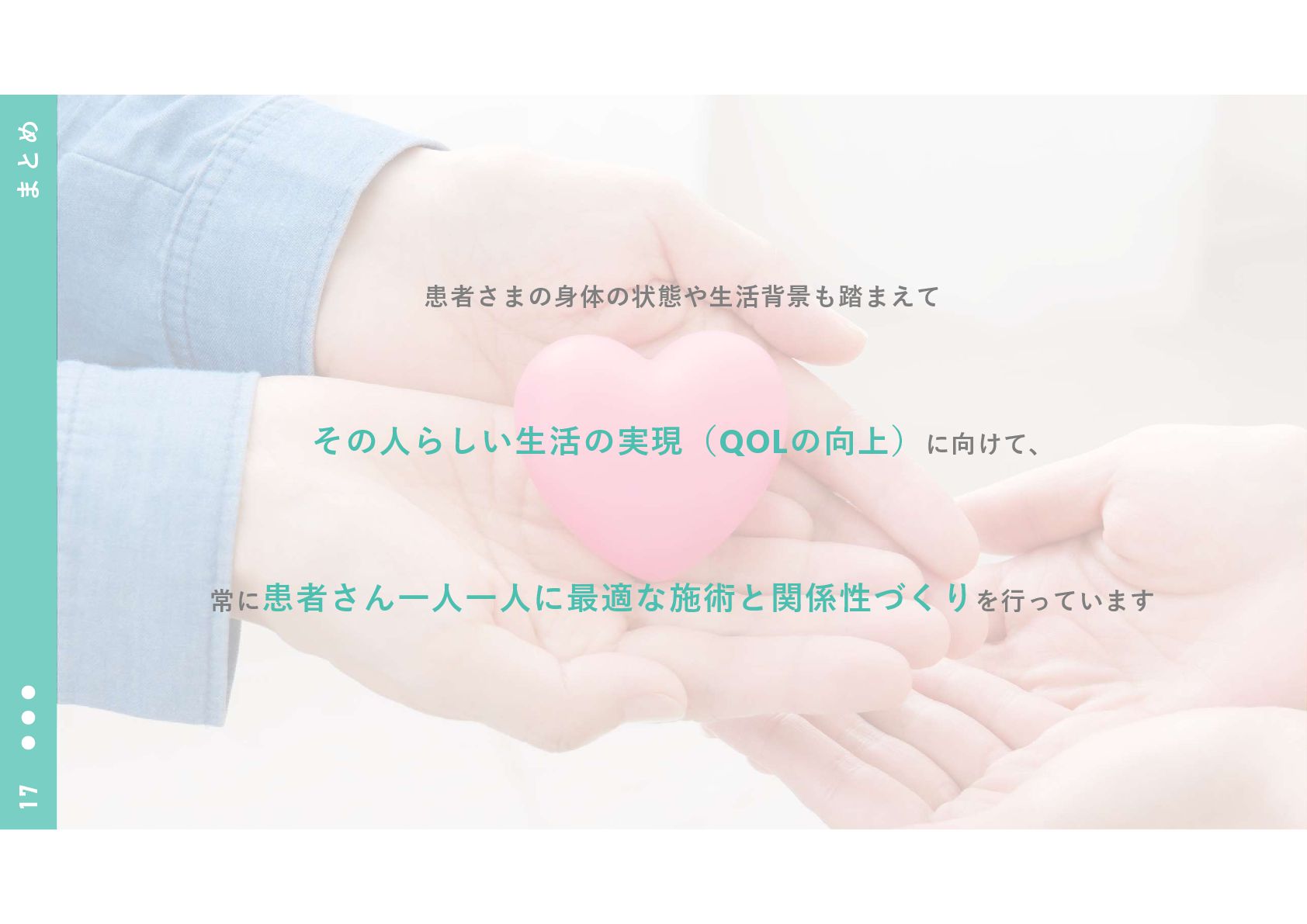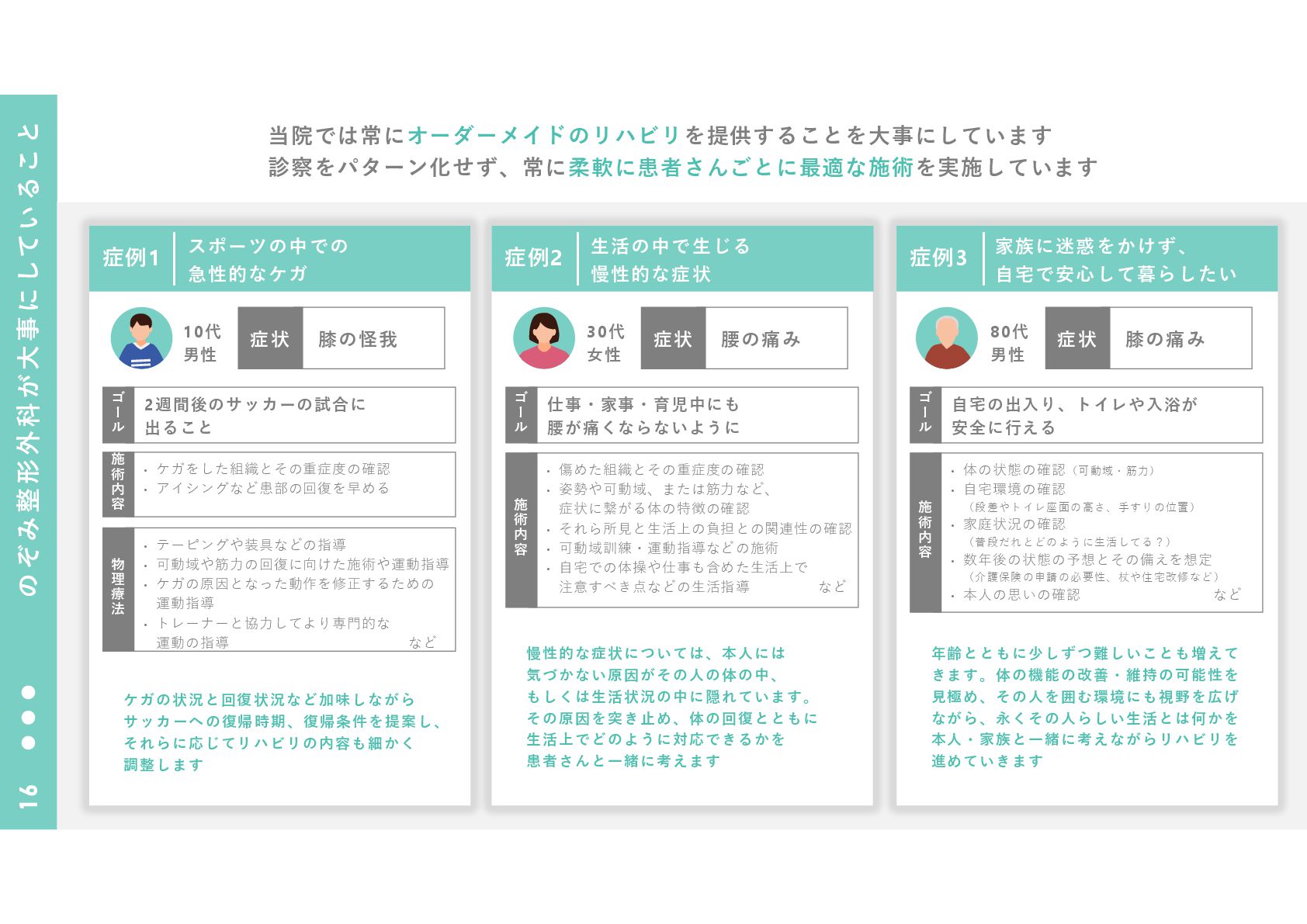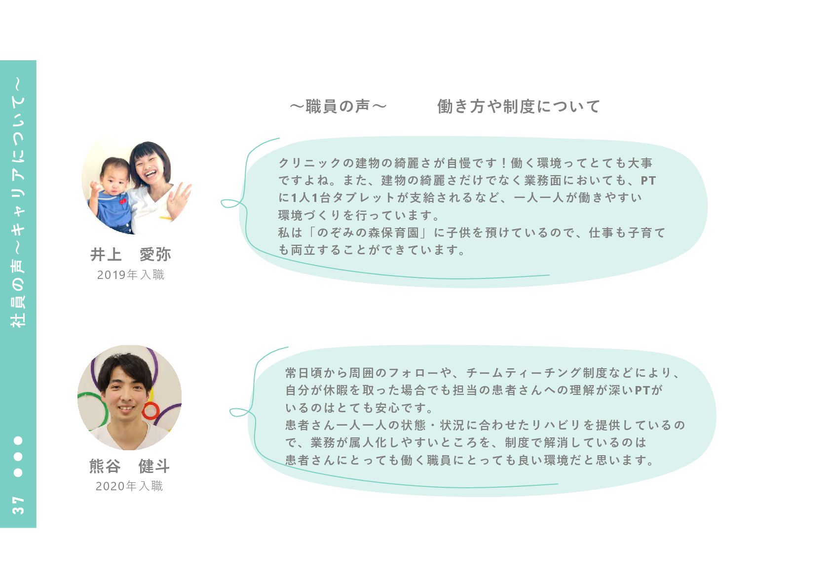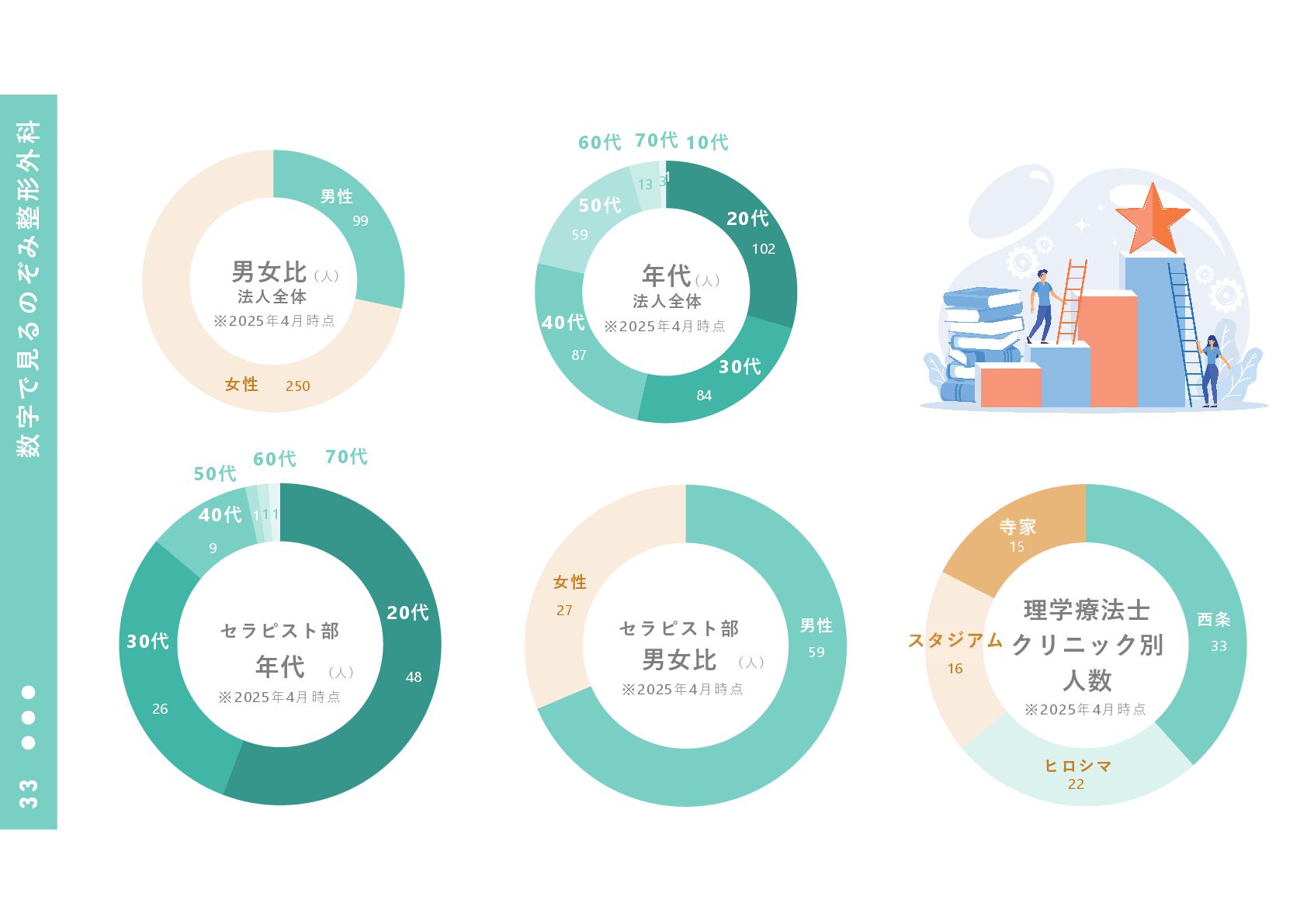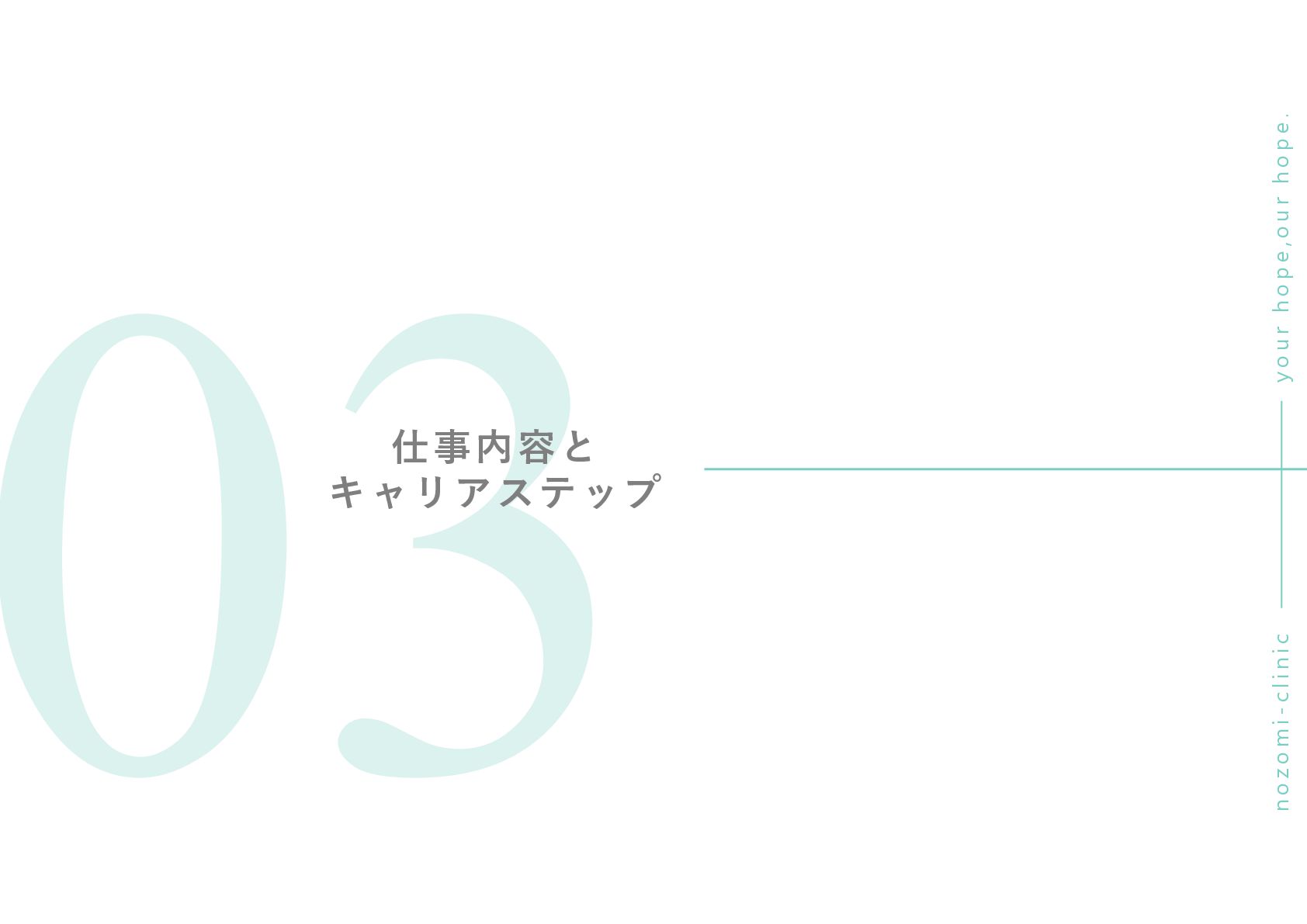 来院数 早期に様々な症例の経験が積めるため、スキルが身に付くスピードも速いことが特徴 平均対応人数/日 入 職 後 13,432 7,996 5,863 4,927 西 条 整 形 ヒ ロ シ マ 整 形 寺 家 整 形 ス タ ジ ア ム 整 形 来院患者数/月 1,157 577 559 449 西 条 整 形 ヒ ロ シ マ 整 形 寺 家 整 形 ス タ ジ ア ム 整 形 初診数/月 47 23 23 18 西 条 整 形 ヒ ロ シ マ 整 形 寺 家 整 形 ス タ ジ ア ム 整 形 初診数/日 当院 200~600名の来院がある 1 カ 月 3 カ 月 半 年 5人 5~10人 10~15人 ※ 整形外科クリニック 平均来院数 100名/日 程度