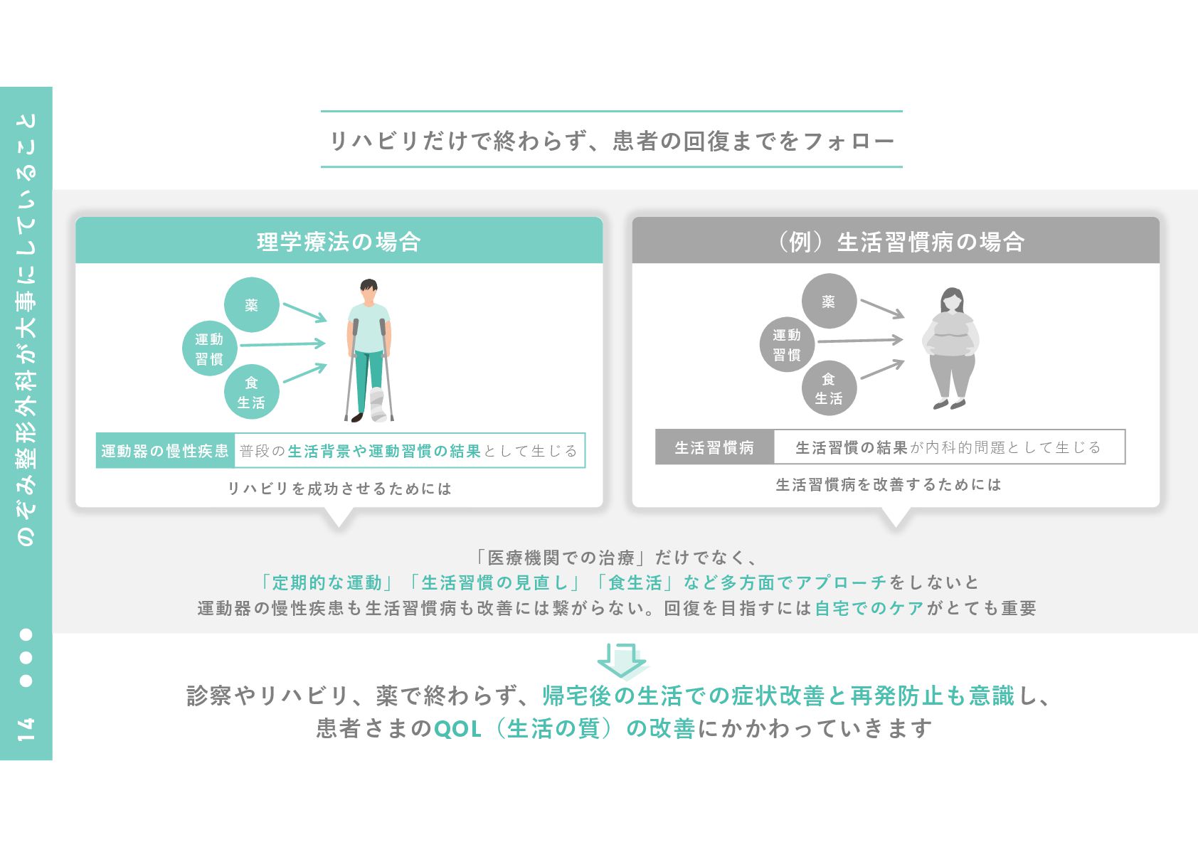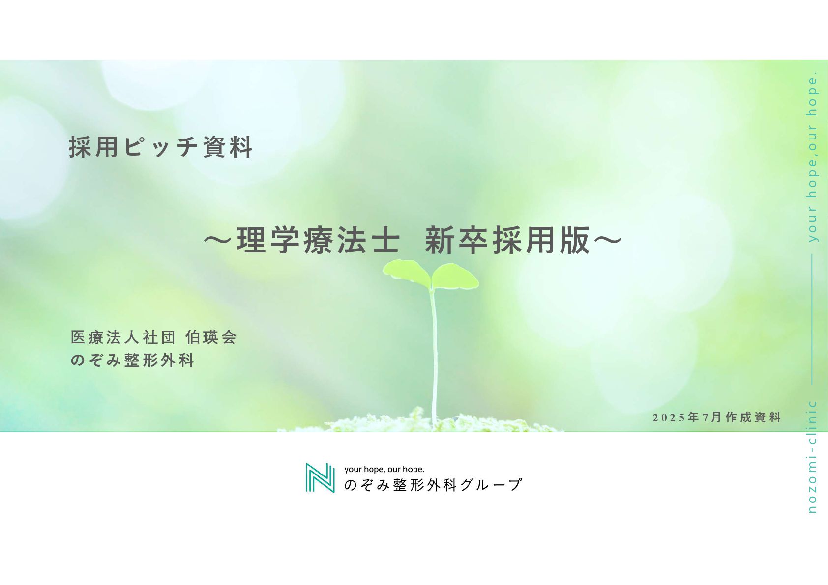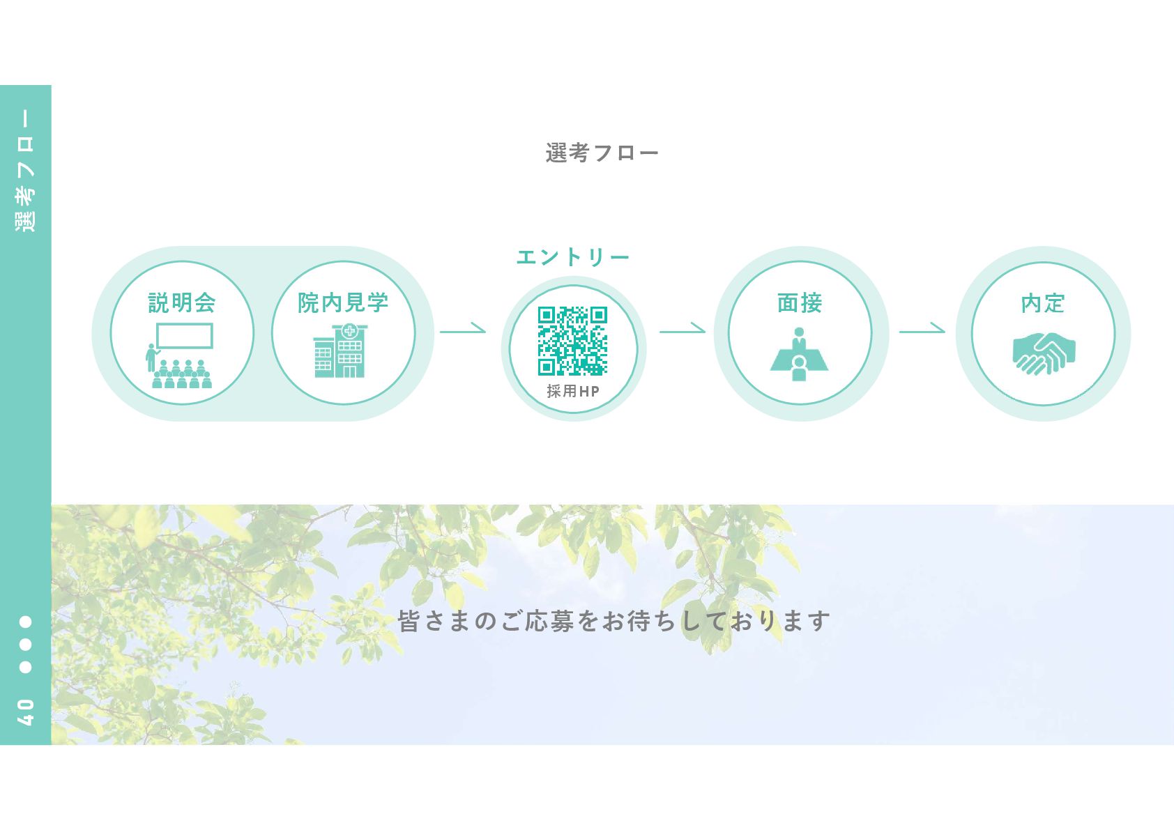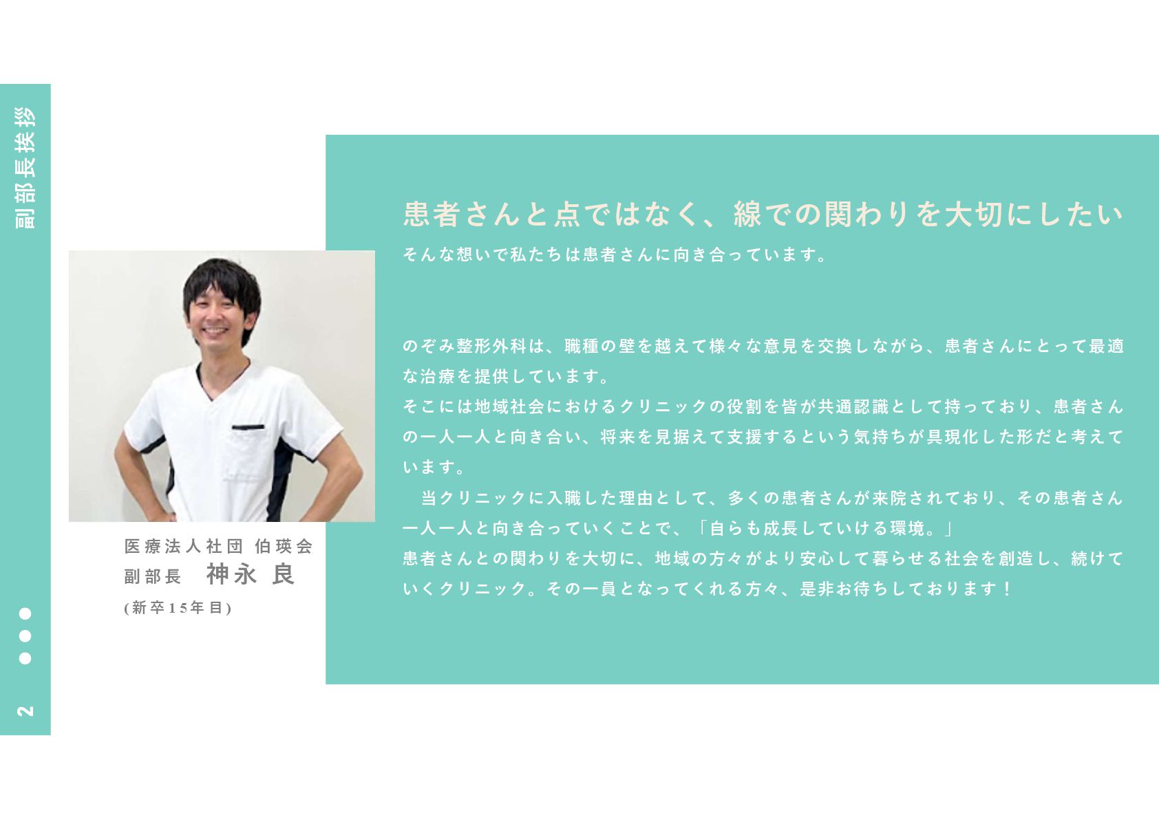 来院数 早期に様々な症例の経験が積めるため、スキルが身に付くスピードも速いことが特徴 平均対応人数/日 入 職 後 13,432 7,996 5,863 4,927 西 条 整 形 ヒ ロ シ マ 整 形 寺 家 整 形 ス タ ジ ア ム 整 形 来院患者数/月 1,157 577 559 449 西 条 整 形 ヒ ロ シ マ 整 形 寺 家 整 形 ス タ ジ ア ム 整 形 初診数/月 47 23 23 18 西 条 整 形 ヒ ロ シ マ 整 形 寺 家 整 形 ス タ ジ ア ム 整 形 初診数/日 当院 200~600名の来院がある 1 カ 月 3 カ 月 半 年 5人 5~10人 10~15人 ※ 整形外科クリニック 平均来院数 100名/日 程度