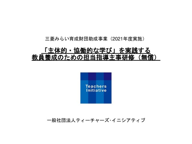 月 12 月 1 月 2 月 3 月 キック オフ 合宿 2泊3 日 全体の 流れ 4 月 オンライン講義 (全3回) ラーニ ングデ ザイン セッシ ョン 1日 オンラ イン ラボ(4-5人で のグループ活動) ラボ 発表 会 1日 対面 シンポ ジウム 実践報 告会 半日 対面 現場での実践 <主体的に話し合う体験> <理論とノウハウの学習> <現場での実践> ・・・実施プログラム ・・・受講者による自主活動(事務局によるサポート・フォロー) 合宿やラーニングデザインセッション、オンライン講義での体験を踏まえて、 地元の教員たちが学ぶためのプログラムを他エリアの指導主事と協働で開発