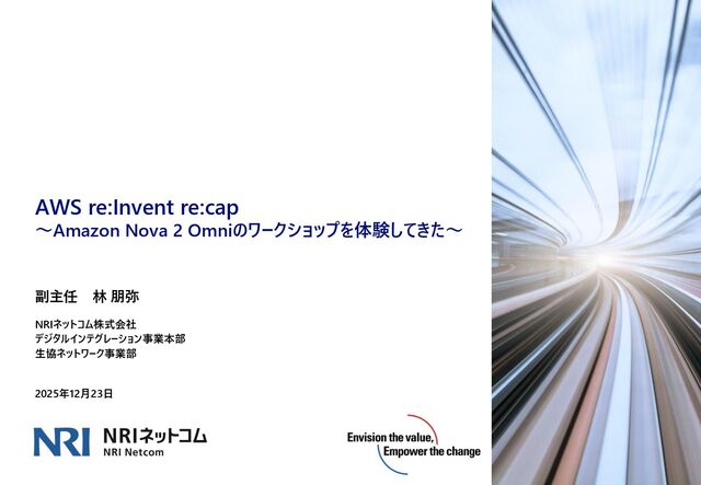 [NEW LAUNCH] Building intelligent multimodal applications with Amazon Nova 2 Omni [REPEAT] (AIM428-R1) ワークショップの内容 Lab1:テキスト&画像生成 Lab2:画像編集 Lab3:会議分析(音声理解) Lab4:動画理解 Lab5:組み込みシステムツール Lab6:マルチモーダルRAG Lab7:不動産アシスタント https://github.com/aws-samples/sample-building-intelligent-multimodal-applications-with-Nova 3.ワークショップ