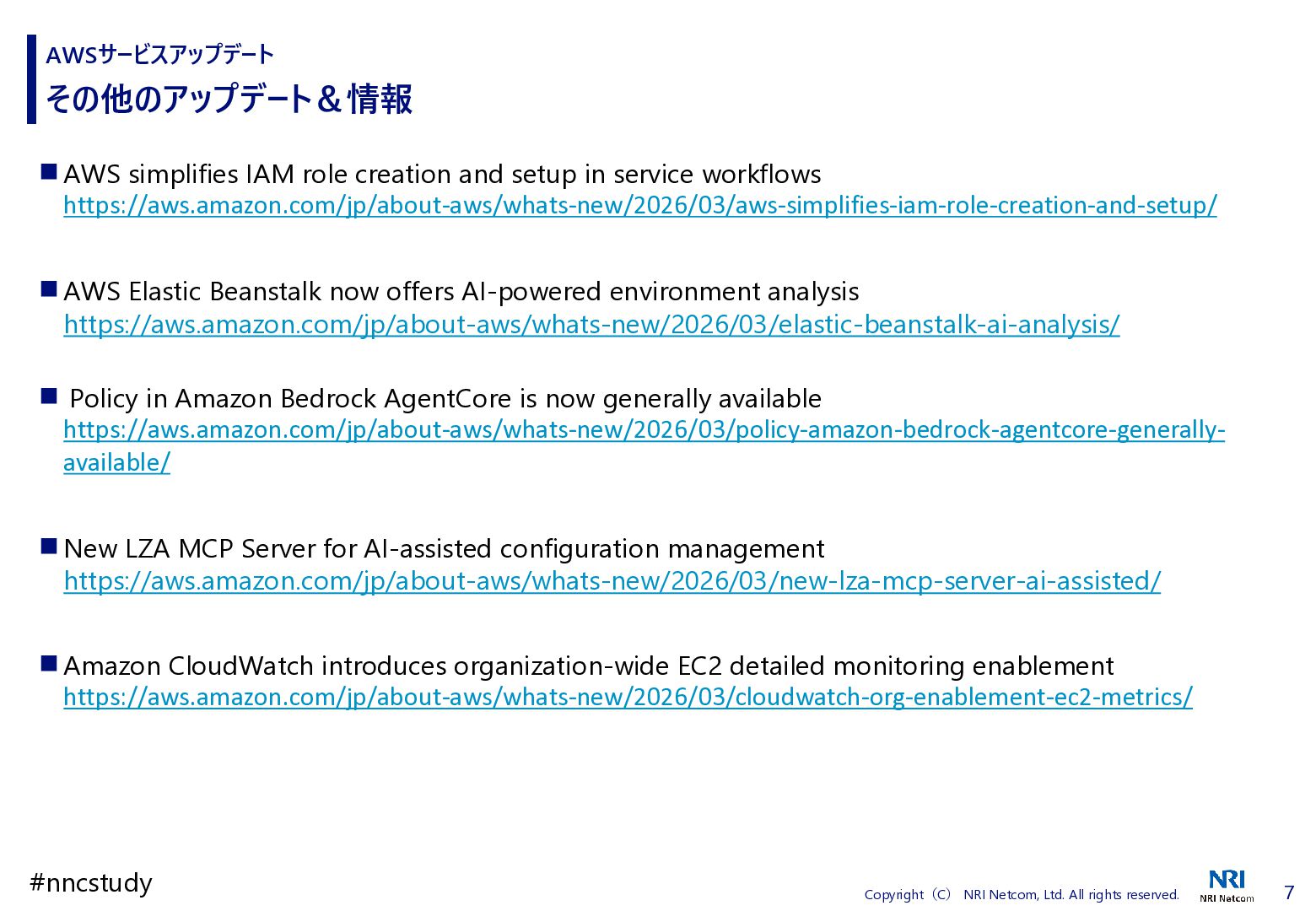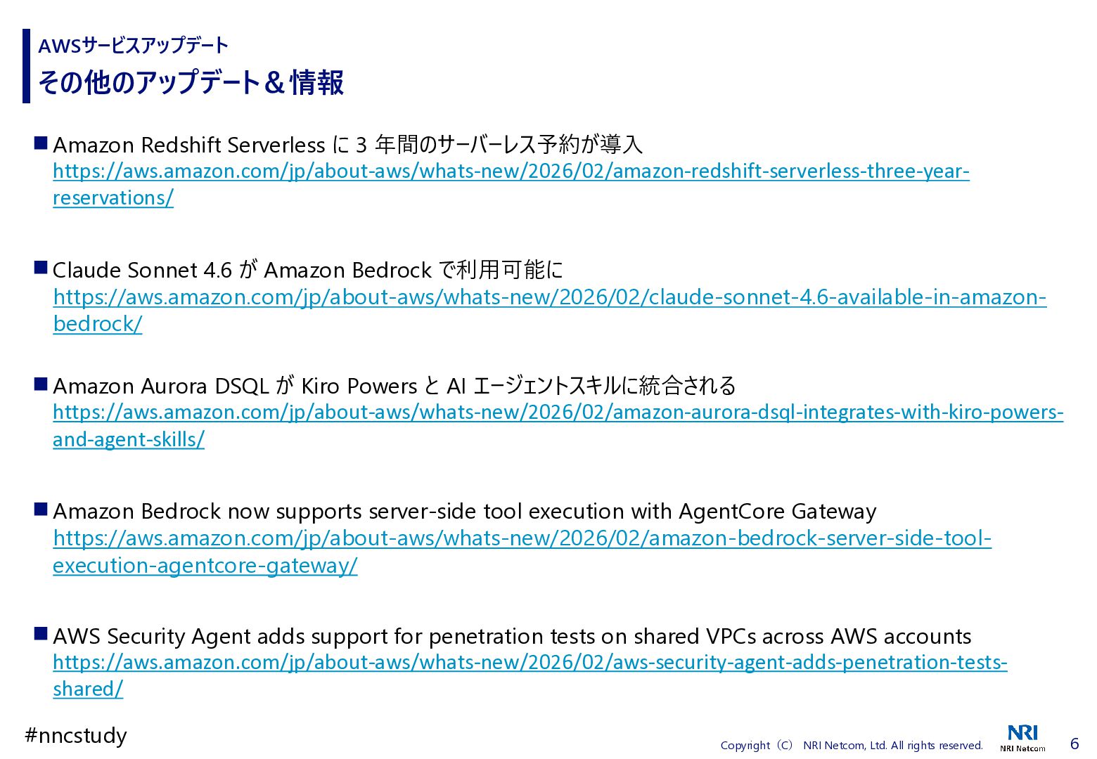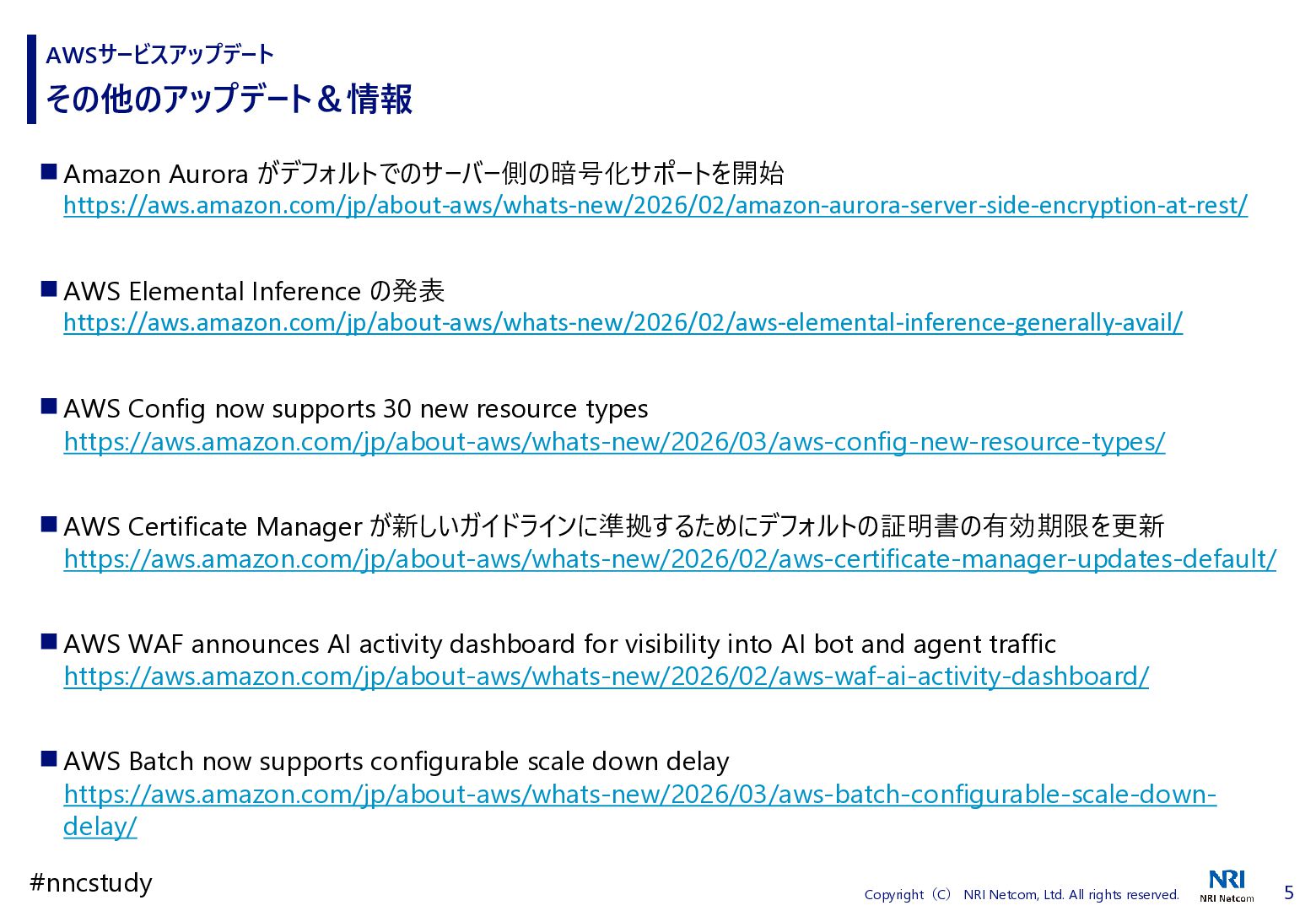 ◼ Amazon Aurora がデフォルトでのサーバー側の暗号化サポートを開始 https://aws.amazon.com/jp/about-aws/whats-new/2026/02/amazon-aurora-server-side-encryption-at-rest/ ◼ AWS Elemental Inference の発表 https://aws.amazon.com/jp/about-aws/whats-new/2026/02/aws-elemental-inference-generally-avail/ ◼ AWS Config now supports 30 new resource types https://aws.amazon.com/jp/about-aws/whats-new/2026/03/aws-config-new-resource-types/ ◼ AWS Certificate Manager が新しいガイドラインに準拠するためにデフォルトの証明書の有効期限を更新 https://aws.amazon.com/jp/about-aws/whats-new/2026/02/aws-certificate-manager-updates-default/ ◼ AWS WAF announces AI activity dashboard for visibility into AI bot and agent traffic https://aws.amazon.com/jp/about-aws/whats-new/2026/02/aws-waf-ai-activity-dashboard/ ◼ AWS Batch now supports configurable scale down delay https://aws.amazon.com/jp/about-aws/whats-new/2026/03/aws-batch-configurable-scale-down- delay/ AWSサービスアップデート