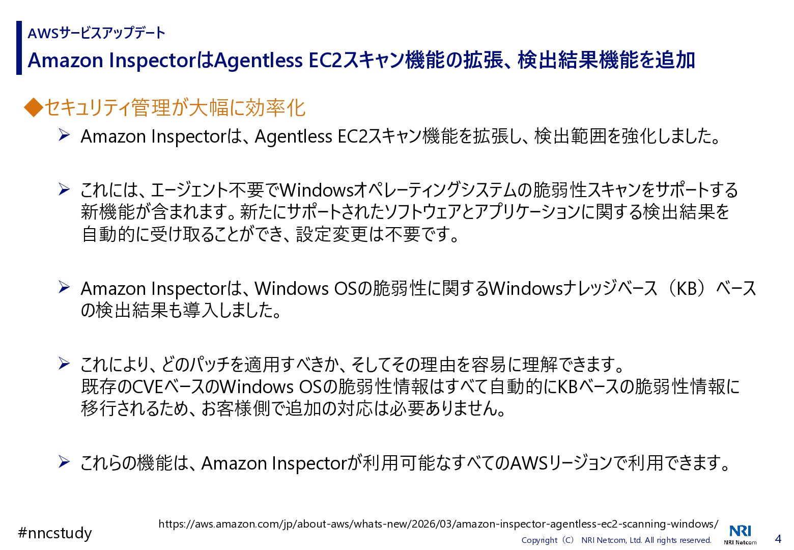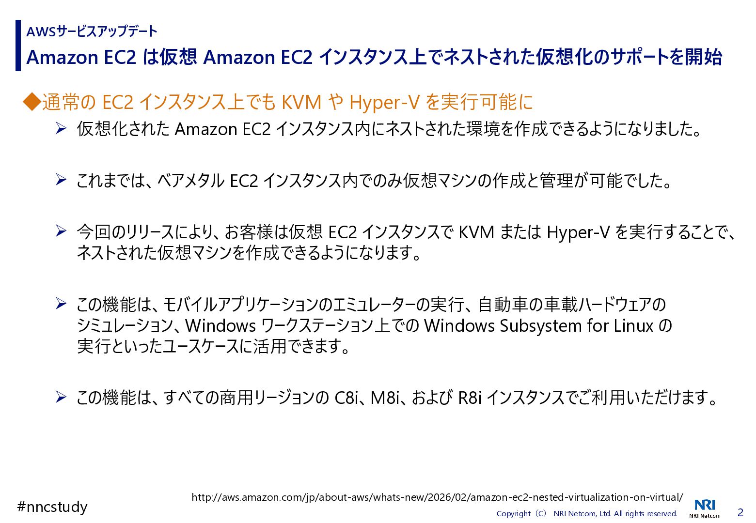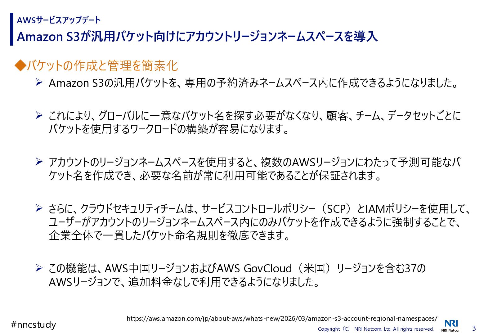◼ Amazon Aurora がデフォルトでのサーバー側の暗号化サポートを開始 https://aws.amazon.com/jp/about-aws/whats-new/2026/02/amazon-aurora-server-side-encryption-at-rest/ ◼ AWS Elemental Inference の発表 https://aws.amazon.com/jp/about-aws/whats-new/2026/02/aws-elemental-inference-generally-avail/ ◼ AWS Config now supports 30 new resource types https://aws.amazon.com/jp/about-aws/whats-new/2026/03/aws-config-new-resource-types/ ◼ AWS Certificate Manager が新しいガイドラインに準拠するためにデフォルトの証明書の有効期限を更新 https://aws.amazon.com/jp/about-aws/whats-new/2026/02/aws-certificate-manager-updates-default/ ◼ AWS WAF announces AI activity dashboard for visibility into AI bot and agent traffic https://aws.amazon.com/jp/about-aws/whats-new/2026/02/aws-waf-ai-activity-dashboard/ ◼ AWS Batch now supports configurable scale down delay https://aws.amazon.com/jp/about-aws/whats-new/2026/03/aws-batch-configurable-scale-down- delay/ AWSサービスアップデート