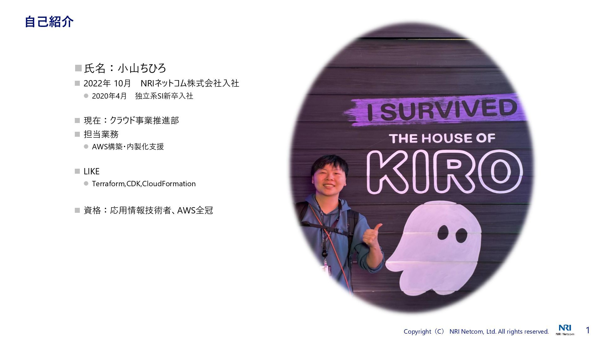 ◼ 2022年 10月 NRIネットコム株式会社入社 ⚫ 2020年4月 独立系SI新卒入社 ◼ 現在:クラウド事業推進部 ◼ 担当業務 ⚫ AWS構築・内製化支援 ◼ LIKE ⚫ Terraform,CDK,CloudFormation ◼ 資格:応用情報技術者、AWS全冠