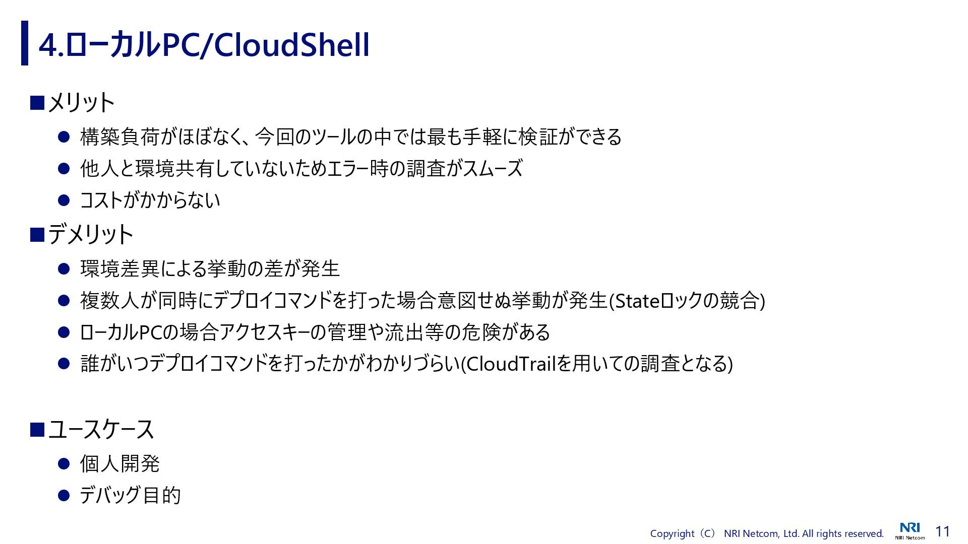 構築負荷がほぼなく、今回のツールの中では最も手軽に検証ができる ⚫ 他人と環境共有していないためエラー時の調査がスムーズ ⚫ コストがかからない ◼デメリット ⚫ 環境差異による挙動の差が発生 ⚫ 複数人が同時にデプロイコマンドを打った場合意図せぬ挙動が発生(Stateロックの競合) ⚫ ローカルPCの場合アクセスキーの管理や流出等の危険がある ⚫ 誰がいつデプロイコマンドを打ったかがわかりづらい(CloudTrailを用いての調査となる) ◼ユースケース ⚫ 個人開発 ⚫ デバッグ目的 4.ローカルPC/CloudShell