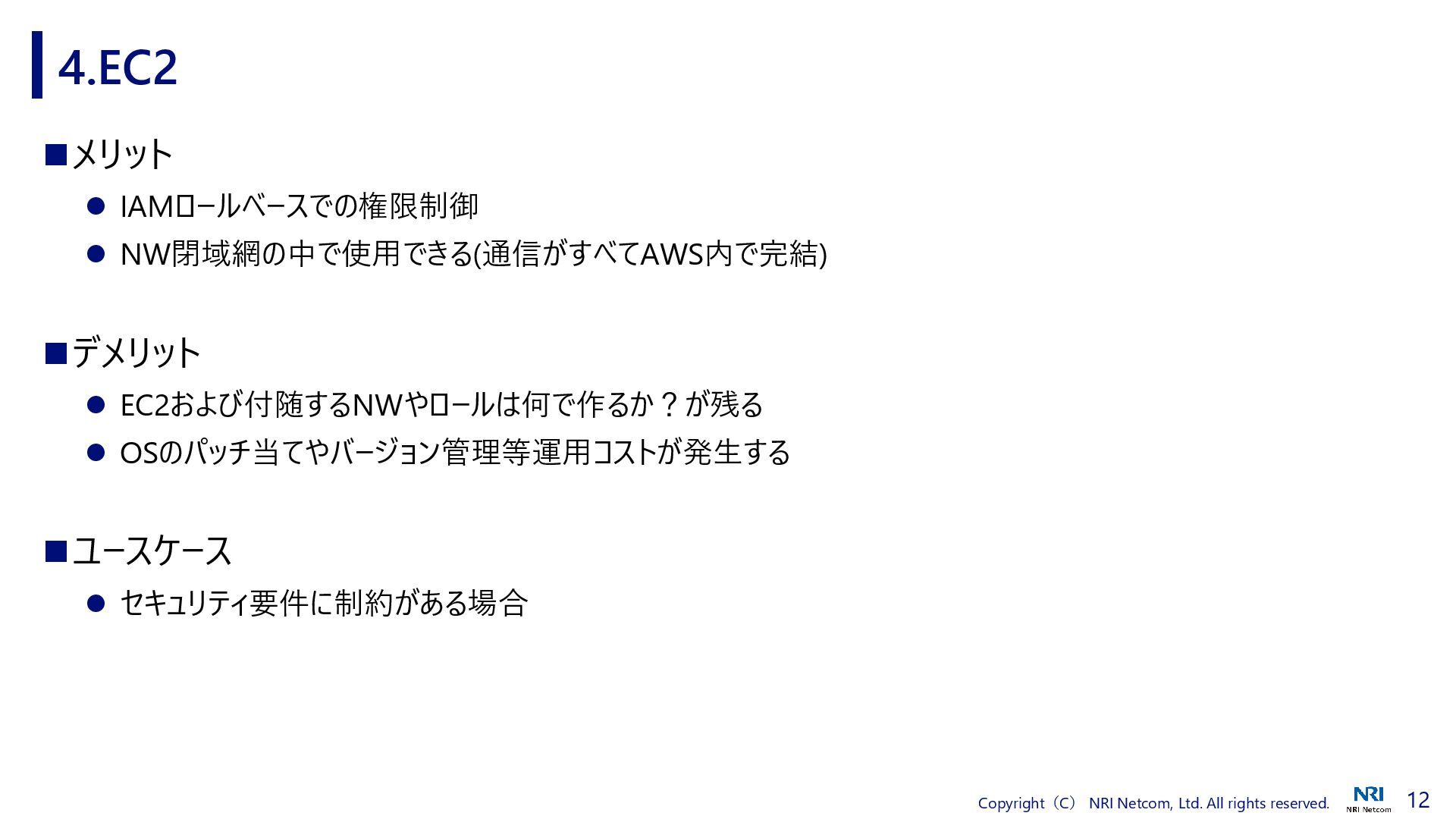 IAMロールベースでの権限制御 ⚫ NW閉域網の中で使用できる(通信がすべてAWS内で完結) ◼デメリット ⚫ EC2および付随するNWやロールは何で作るか?が残る ⚫ OSのパッチ当てやバージョン管理等運用コストが発生する ◼ユースケース ⚫ セキュリティ要件に制約がある場合 4.EC2