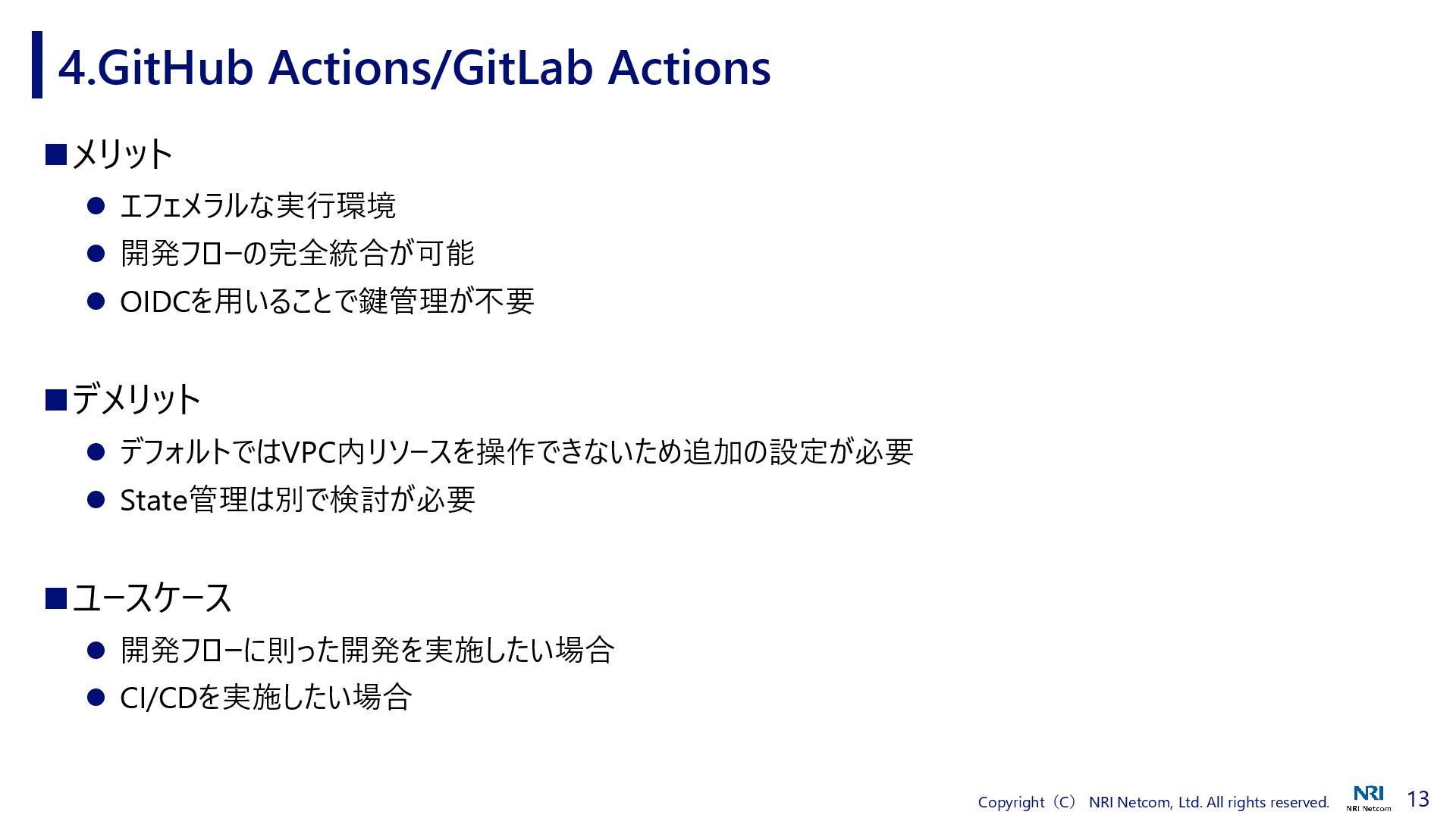 エフェメラルな実行環境 ⚫ 開発フローの完全統合が可能 ⚫ OIDCを用いることで鍵管理が不要 ◼デメリット ⚫ デフォルトではVPC内リソースを操作できないため追加の設定が必要 ⚫ State管理は別で検討が必要 ◼ユースケース ⚫ 開発フローに則った開発を実施したい場合 ⚫ CI/CDを実施したい場合 4.GitHub Actions/GitLab Actions