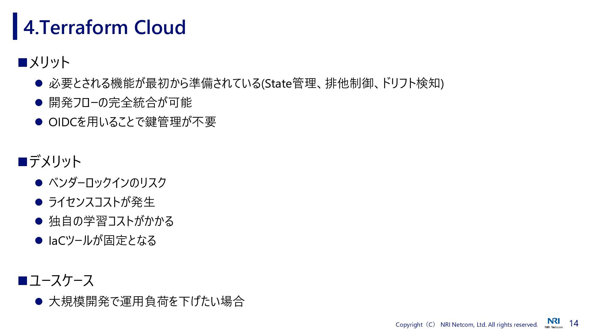 必要とされる機能が最初から準備されている(State管理、排他制御、ドリフト検知) ⚫ 開発フローの完全統合が可能 ⚫ OIDCを用いることで鍵管理が不要 ◼デメリット ⚫ ベンダーロックインのリスク ⚫ ライセンスコストが発生 ⚫ 独自の学習コストがかかる ⚫ IaCツールが固定となる ◼ユースケース ⚫ 大規模開発で運用負荷を下げたい場合 4.Terraform Cloud