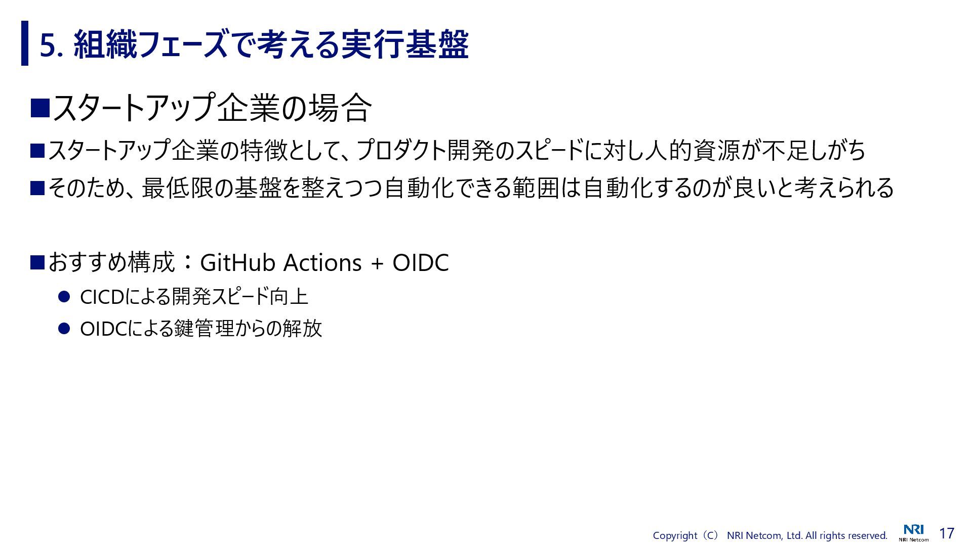 ◼そのため、最低限の基盤を整えつつ自動化できる範囲は自動化するのが良いと考えられる ◼おすすめ構成:GitHub Actions + OIDC ⚫ CICDによる開発スピード向上 ⚫ OIDCによる鍵管理からの解放 5. 組織フェーズで考える実行基盤