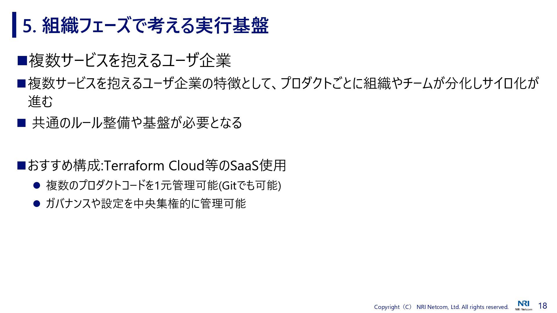進む ◼ 共通のルール整備や基盤が必要となる ◼おすすめ構成:Terraform Cloud等のSaaS使用 ⚫ 複数のプロダクトコードを1元管理可能(Gitでも可能) ⚫ ガバナンスや設定を中央集権的に管理可能 5. 組織フェーズで考える実行基盤
