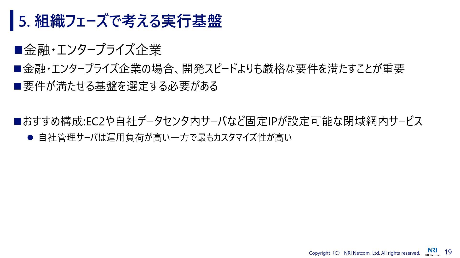 ◼要件が満たせる基盤を選定する必要がある ◼おすすめ構成:EC2や自社データセンタ内サーバなど固定IPが設定可能な閉域網内サービス ⚫ 自社管理サーバは運用負荷が高い一方で最もカスタマイズ性が高い 5. 組織フェーズで考える実行基盤