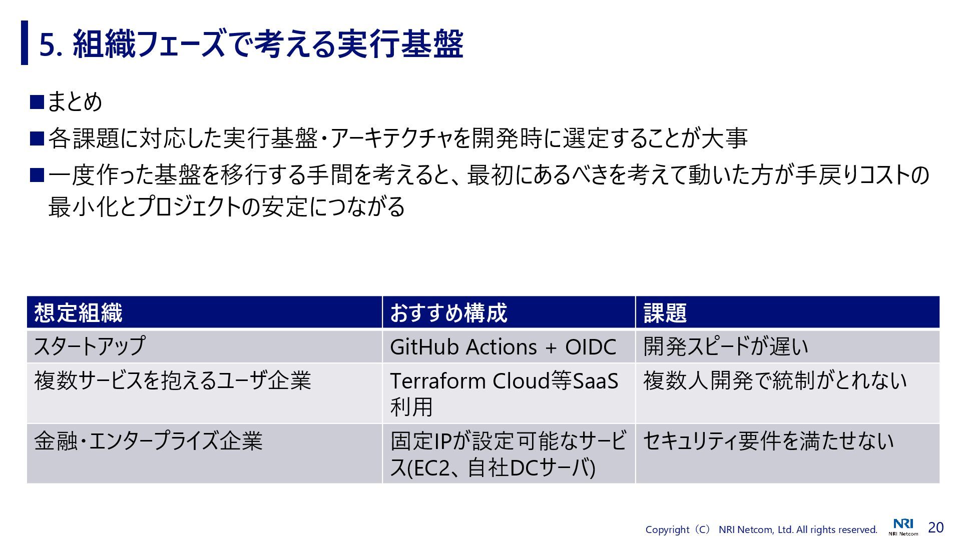 ◼一度作った基盤を移行する手間を考えると、最初にあるべきを考えて動いた方が手戻りコストの 最小化とプロジェクトの安定につながる 5. 組織フェーズで考える実行基盤 想定組織 おすすめ構成 課題 スタートアップ GitHub Actions + OIDC 開発スピードが遅い 複数サービスを抱えるユーザ企業 Terraform Cloud等SaaS 利用 複数人開発で統制がとれない 金融・エンタープライズ企業 固定IPが設定可能なサービ ス(EC2、自社DCサーバ) セキュリティ要件を満たせない