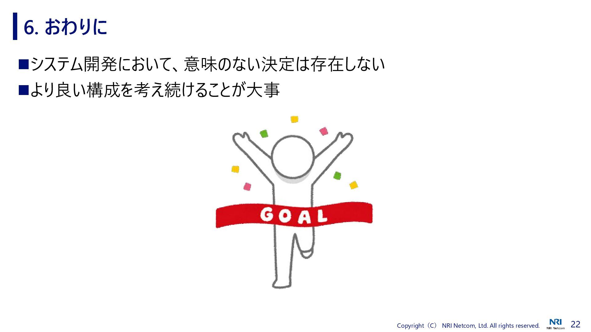 22 Copyright(C) NRI Netcom, Ltd. All rights reserved. ◼システム開発において、意味のない決定は存在しない ◼より良い構成を考え続けることが大事