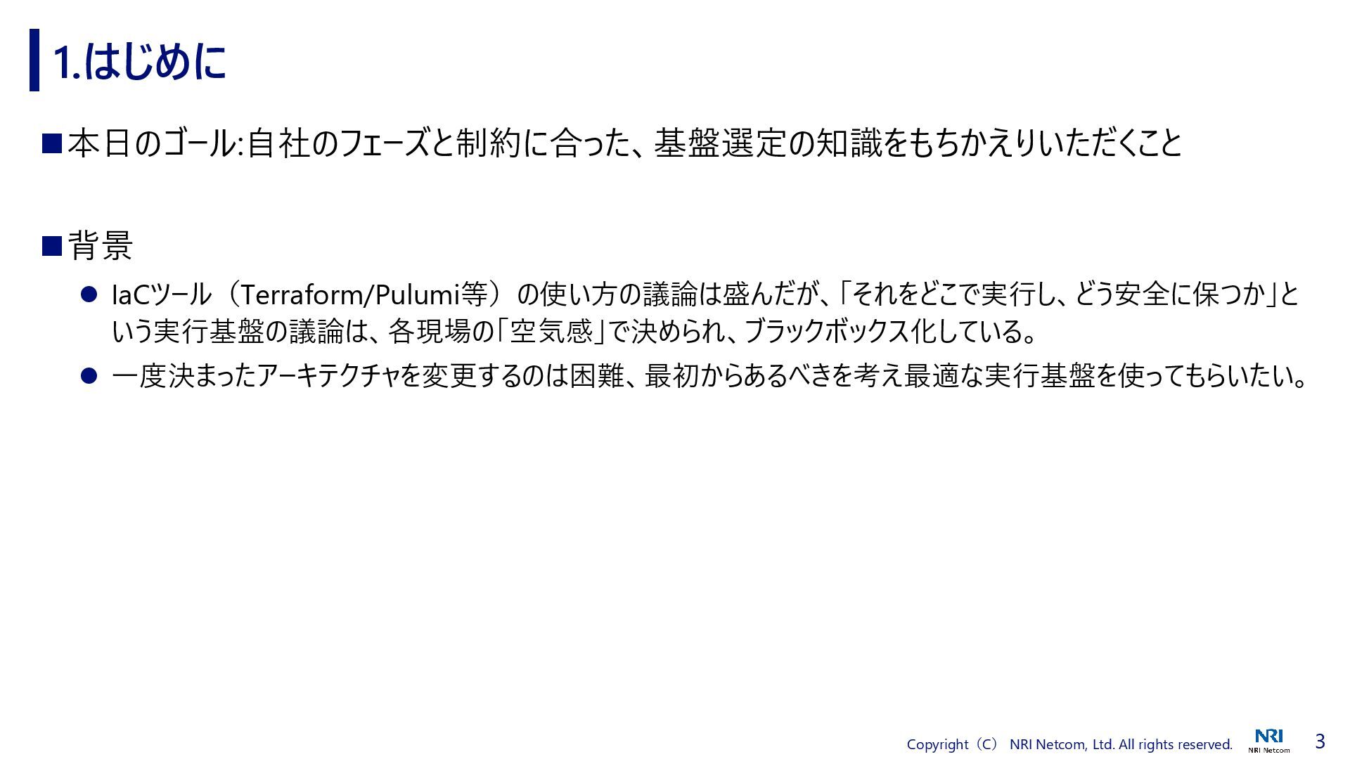 ⚫ IaCツール(Terraform/Pulumi等)の使い方の議論は盛んだが、「それをどこで実行し、どう安全に保つか」と いう実行基盤の議論は、各現場の「空気感」で決められ、ブラックボックス化している。 ⚫ 一度決まったアーキテクチャを変更するのは困難、最初からあるべきを考え最適な実行基盤を使ってもらいたい。 1.はじめに