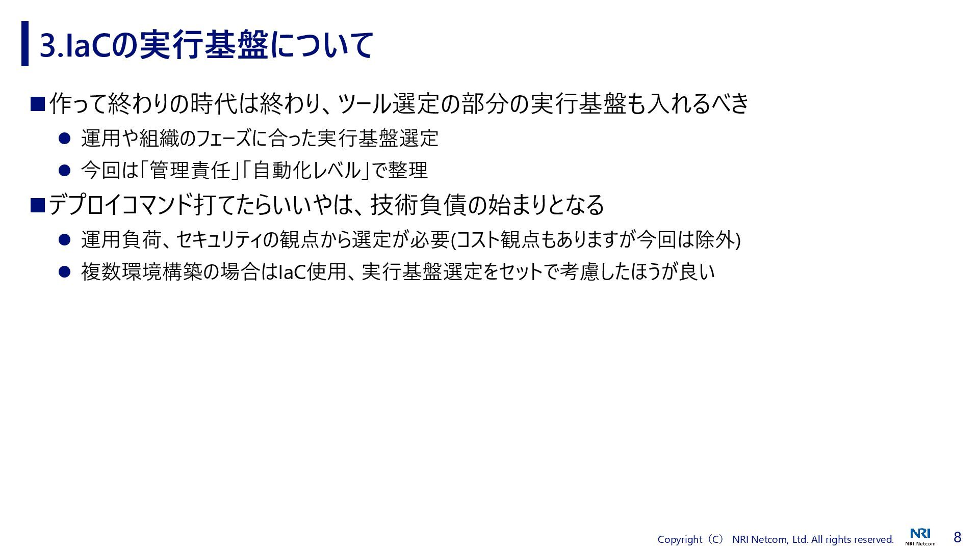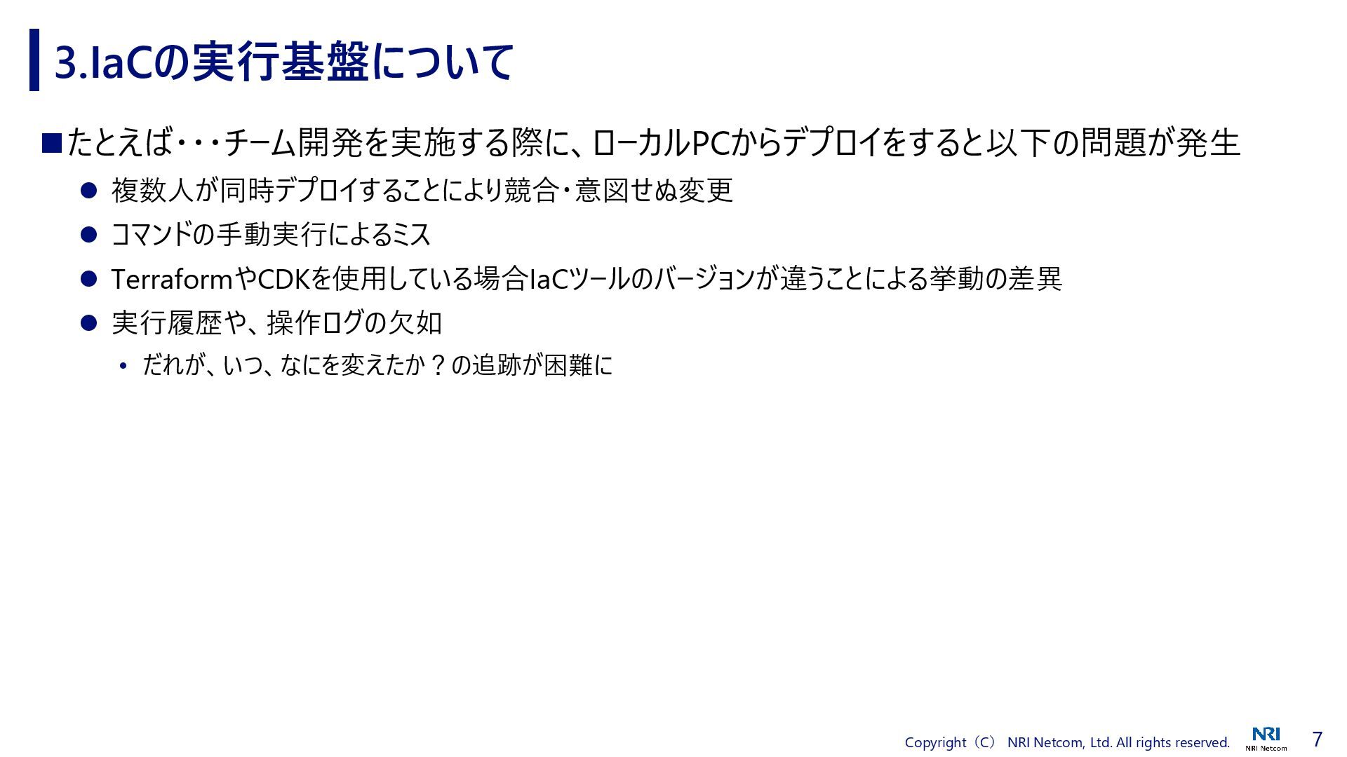 6 Copyright(C) NRI Netcom, Ltd. All rights reserved. 3. IaCの実行基盤について