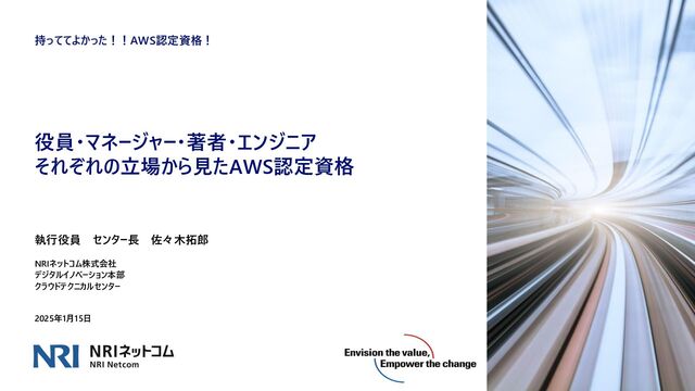 区分 コード 受験日 合否 ソリューションアーキテクト Associate PR000005 2013-06-05 ソリューションアーキテクト(プロ) Professional PR000030 2016-05-24 Developer Associate PR000029 2016-09-23 SysOps Associate PR000022 2016-10-20 DevOps Professional PR000075 2016-11-10 ソリューションアーキテクト(プロ・再認定) Professional SAP-R00 2018-05-22 セキュリティ Specialty SCS-C01 2018-10-10 ビックデータ Specialty BDS-C00 2018-10-24 不合格 DevOps(再認定) Professional DOP-R00 2018-11-22 不合格 DevOps Professional DOP-C01 2019-03-18 クラウドプラクティショナー Foundational CLF-P01 2019-04-16 ビックデータ BDS-C00 BDS-C00 2019-04-26 MachineLearning Specialty MLS-C01 2019-05-24 不合格 MachineLearning Specialty MLS-C01 2019-11-29 アドバンスドネットワーク Specialty ANS-C00 2019-12-23 不合格 アドバンスドネットワーク Specialty ANS-C00 2021-01-15 データベース Specialty DBS-C01 2021-02-08 Alexa Skill Builder Specialty AXS-C01 2021-03-15 試験名 区分 コード 受験日 合否 ソリューションアーキテクト(プロ・再認定) Professional SAP-C01 2021-05-21 データ分析 Specialty DAS-C01 2021-09-22 DevOps(再認定) Professional DOP-C01 2022-03-18 ソリューションアーキテクト(新試験) Associate SAA-C03 2023-01-20 Machine Learning Specialty MLS-C01 2023-02-01 セキュリティ(再認定) Specialty SCS-C01 2023-03-10 SAP on AWS Specialty PAS-C01 2023-02-24 セキュリティ(新試験) Specialty SCS-C02 2023-12-05 アドバンスドネットワーク(再認定) Specialty ANS-C01 2023-12-14 不合格 アドバンスドネットワーク(再認定) Specialty ANS-C01 2024-03-14 データベース(再認定) Specialty DBS-C01 2024-03-26 ソリューションアーキテクト(プロ・再認定) Professional SAP-C02 2024-08-28 ◼過去、31回の試験を受けてきました。(26勝5敗)