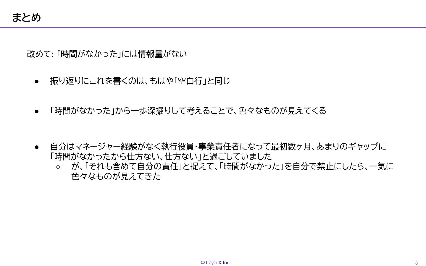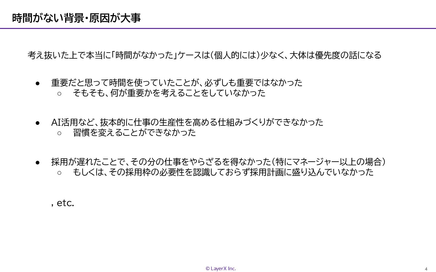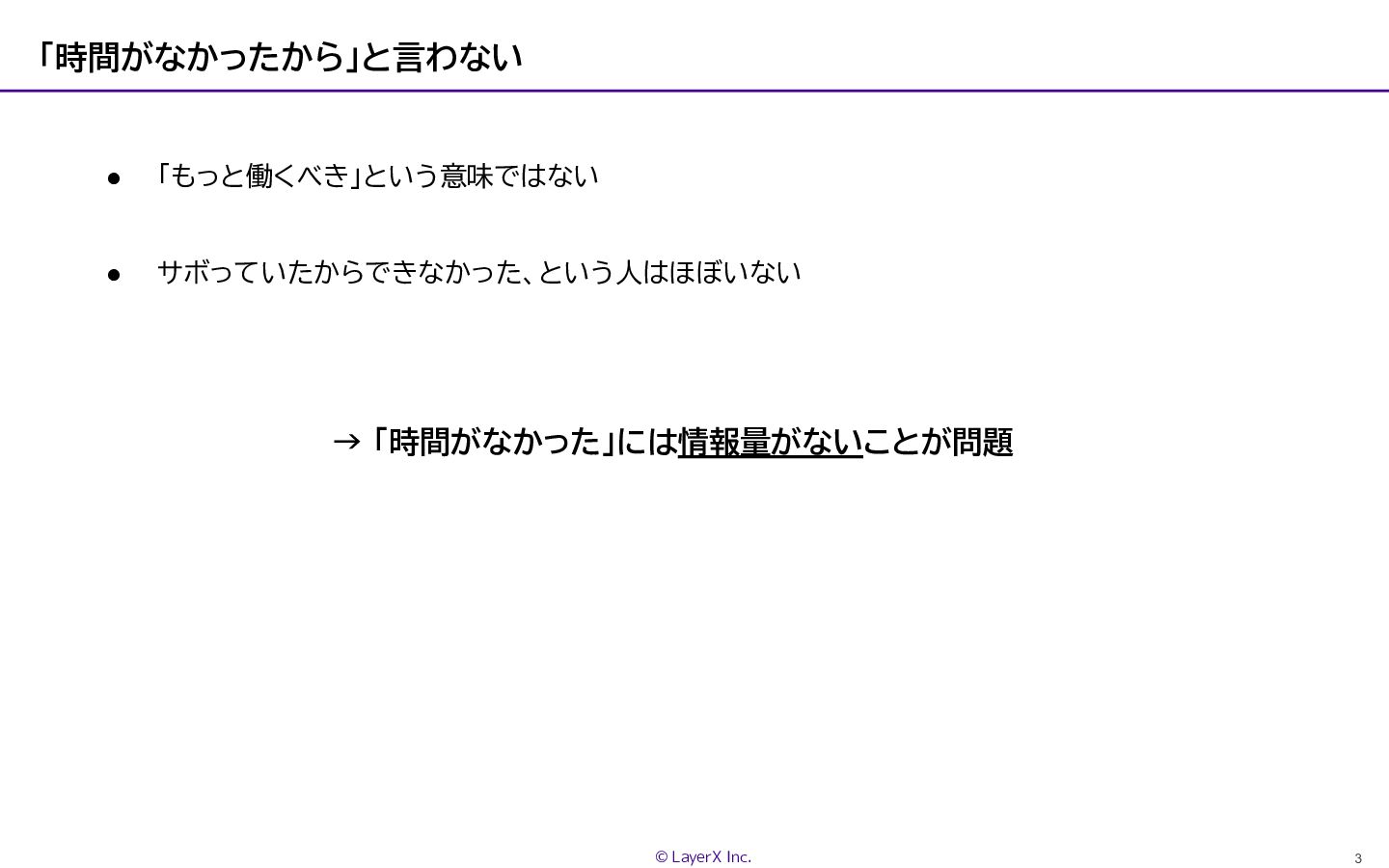 3 © LayerX Inc. 「時間がなかったから」と言わない • 「もっと働くべき」という意味ではない • サボっていたからできなかった、という人はほぼいない →