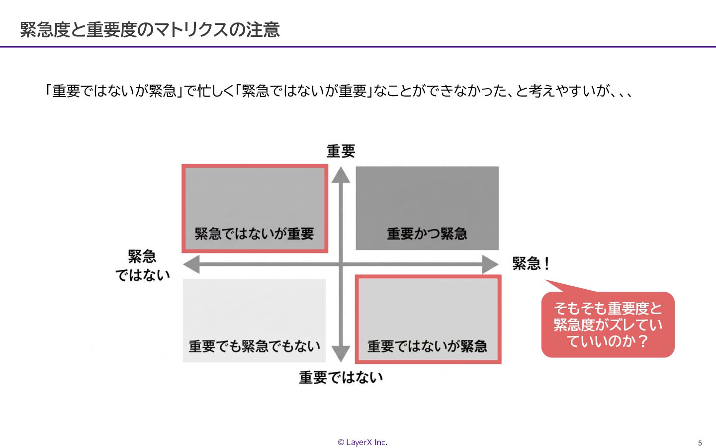 5 © LayerX Inc. 緊急度と重要度のマトリクスの注意 「重要ではないが緊急」で忙しく「緊急ではないが重要」なことができなかった、と考えやすいが、、、 そもそも重要度と 緊急度がズレてい ていいのか?