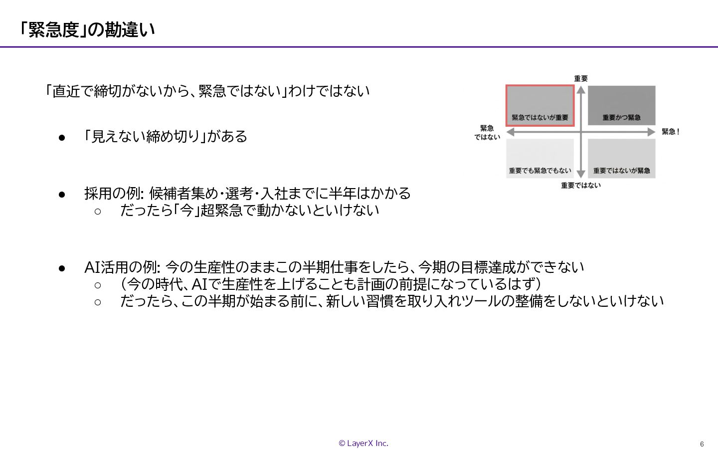 6 © LayerX Inc. 「緊急度」の勘違い 「直近で締切がないから、緊急ではない」わけではない • 「見えない締め切り」がある • 採用の例: