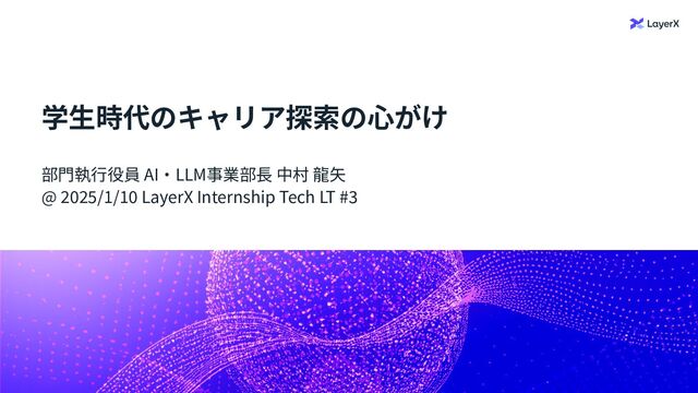 © LayerX Inc. 1 学⽣時代のキャリア探索の⼼がけ 部⾨執⾏役員 AI‧LLM事業部⻑ 中村 ⿓⽮ @