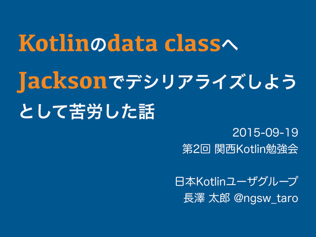 Kotlinͷdata class JacksonͰσγϦΞϥΠζ͠Α͏ ͱͯۤ͠࿑ͨ͠ ୈճؔ,PUMJOษڧձ ! ຊ,PUMJOϢʔβάϧʔϓ ᖒଠ!OHTX@UBSP