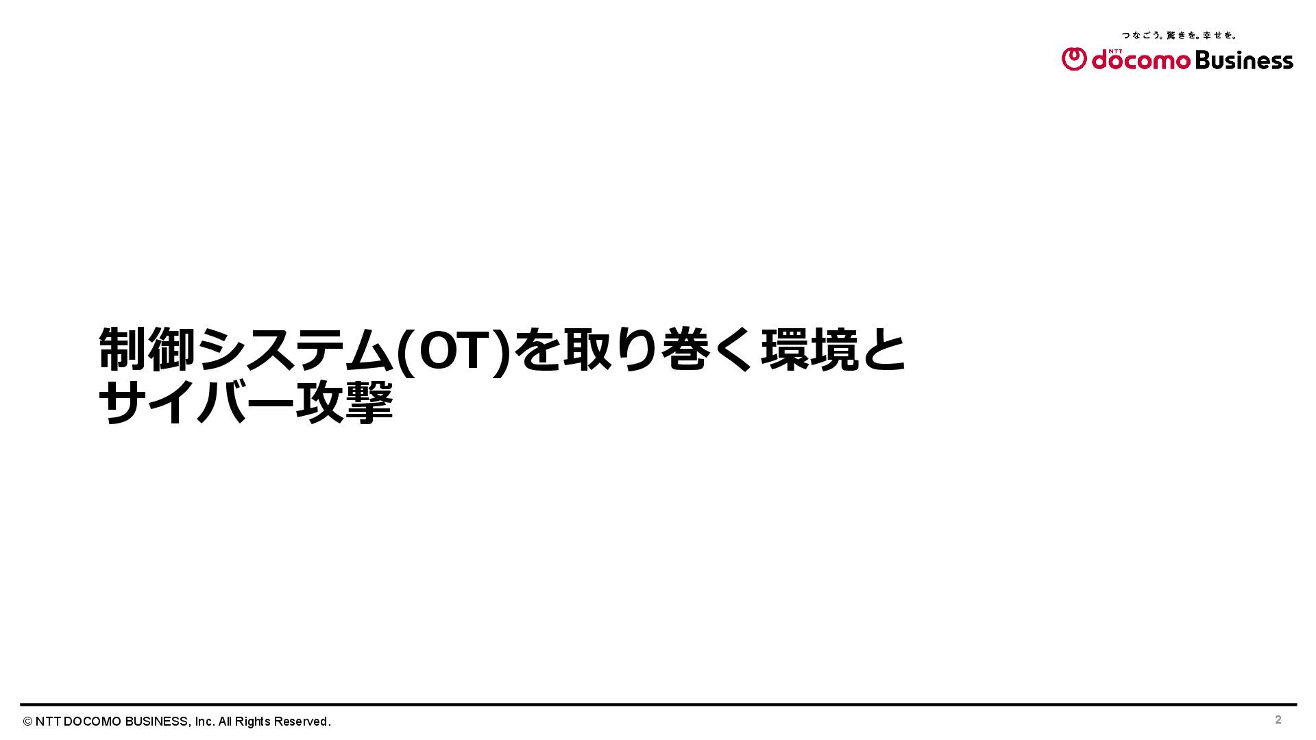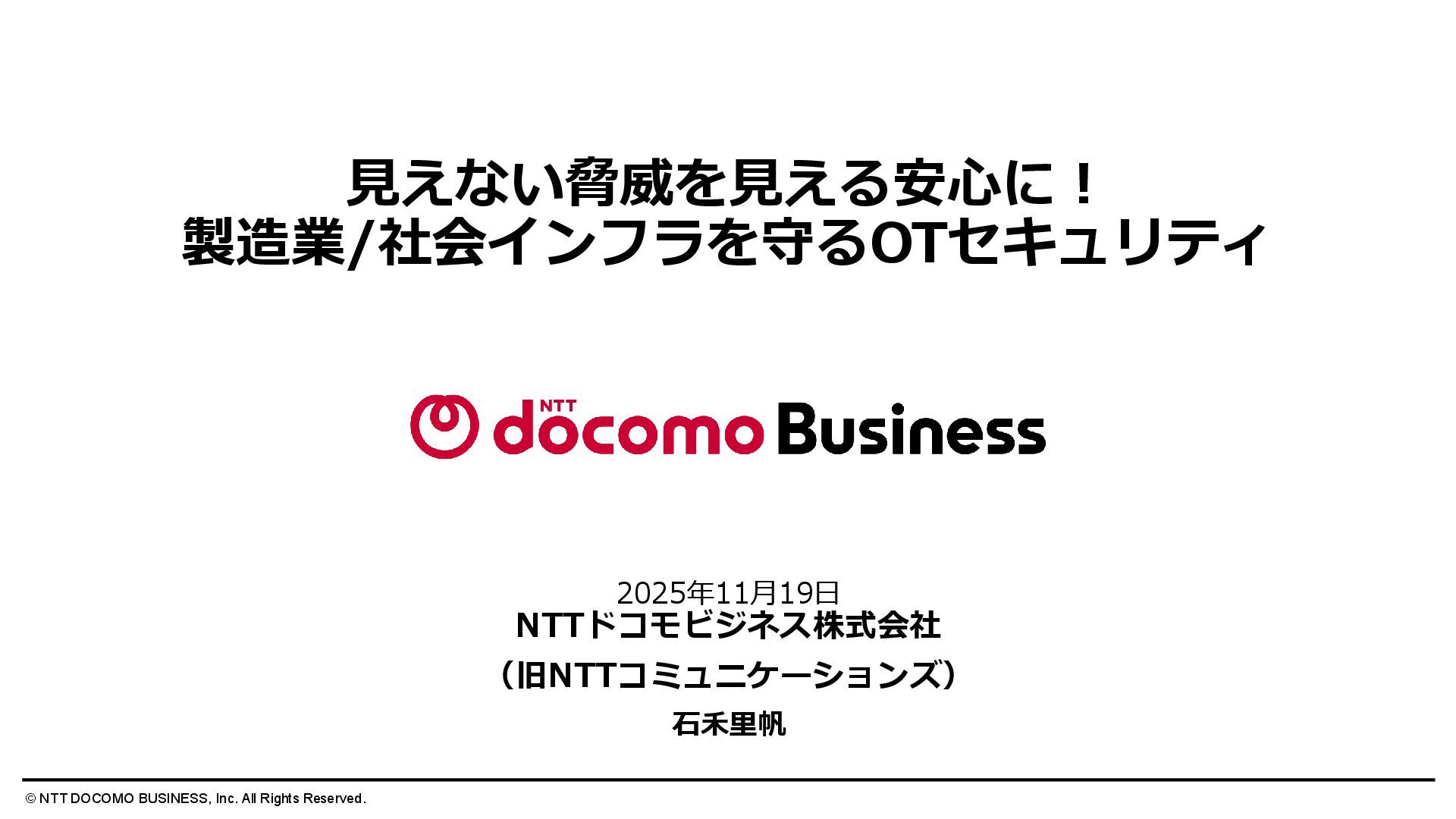 1. © NTT DOCOMO BUSINESS, Inc. All Rights Reserved. 見えない脅威を見える安心に! 製造業/社会インフラを守るOTセキュリティ