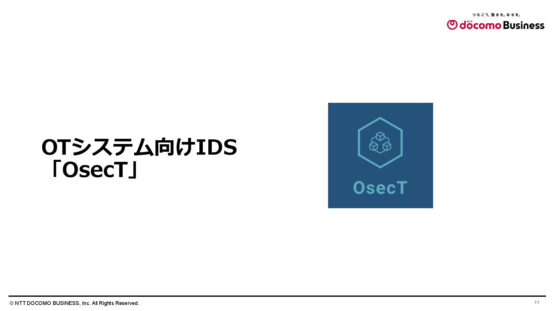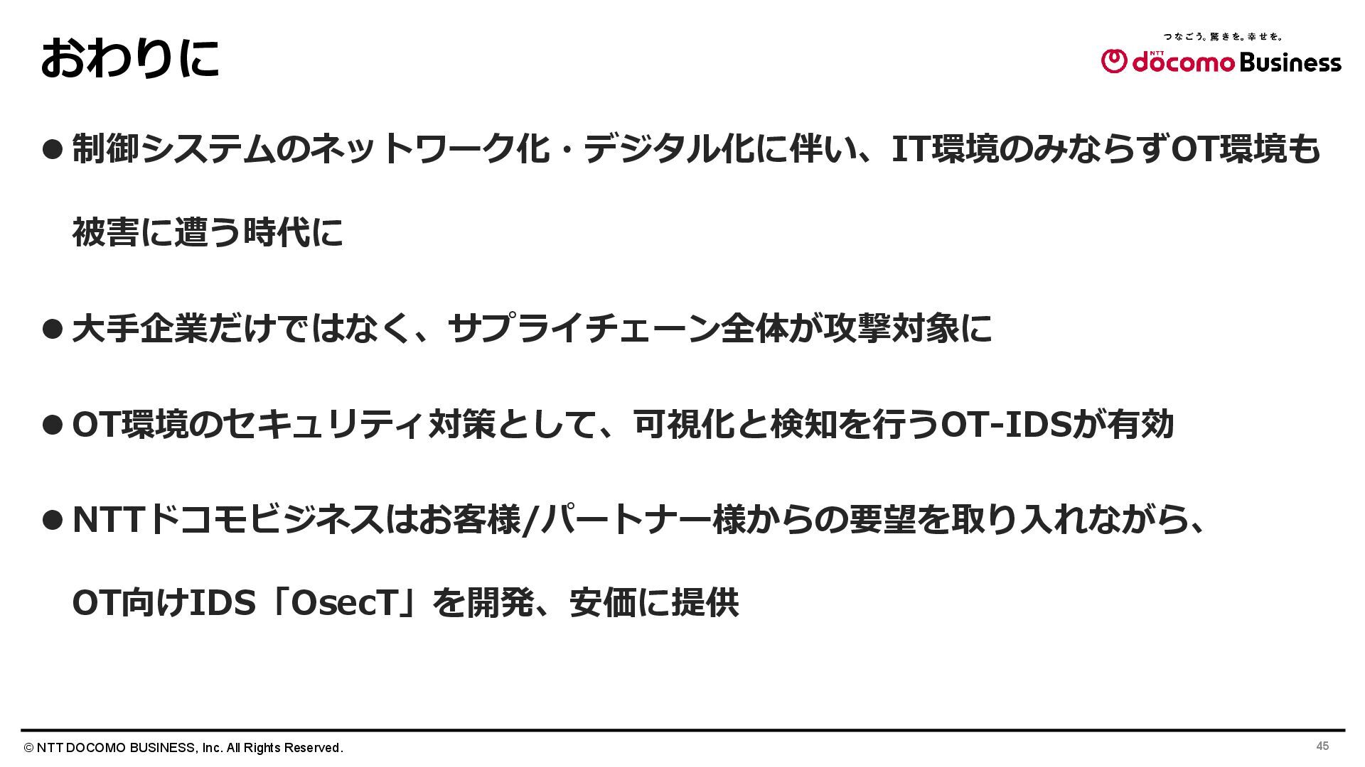 ⚫ 制御システムのネットワーク化・デジタル化に伴い、IT環境のみならずOT環境も 被害に遭う時代に ⚫ 大手企業だけではなく、サプライチェーン全体が攻撃対象に ⚫ OT環境のセキュリティ対策として、可視化と検知を行うOT-IDSが有効 ⚫ NTTドコモビジネスはお客様/パートナー様からの要望を取り入れながら、 OT向けIDS「OsecT」を開発、安価に提供