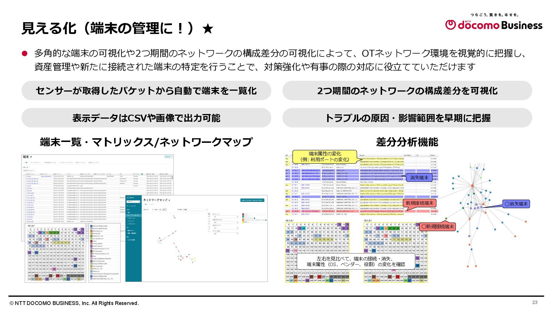 表示データはCSVや画像で出力可能 端末一覧・マトリックス/ネットワークマップ 2つ期間のネットワークの構成差分を可視化 トラブルの原因・影響範囲を早期に把握 差分分析機能 端末属性の変化 (例: 利用ポートの変化) 消失端末 新規接続端末 ◯消失端末 ◯新規接続端末 左右を見比べて、端末の接続・消失、 端末属性(OS、ベンダー、役割)の変化を確認 ⚫ 多角的な端末の可視化や2つ期間のネットワークの構成差分の可視化によって、OTネットワーク環境を視覚的に把握し、 資産管理や新たに接続された端末の特定を行うことで、対策強化や有事の際の対応に役立てていただけます 見える化(端末の管理に!)★