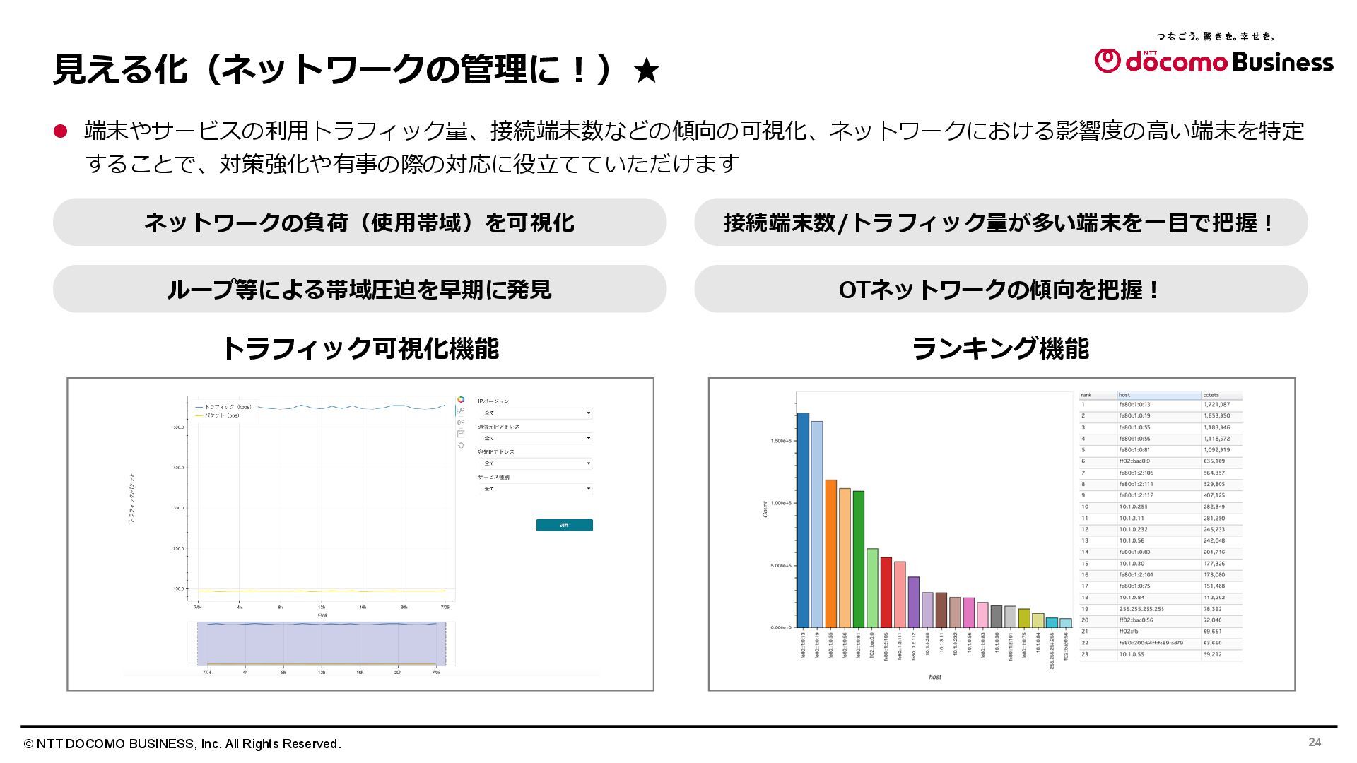 ループ等による帯域圧迫を早期に発見 トラフィック可視化機能 接続端末数/トラフィック量が多い端末を一目で把握! OTネットワークの傾向を把握! ランキング機能 ⚫ 端末やサービスの利用トラフィック量、接続端末数などの傾向の可視化、ネットワークにおける影響度の高い端末を特定 することで、対策強化や有事の際の対応に役立てていただけます 見える化(ネットワークの管理に!)★
