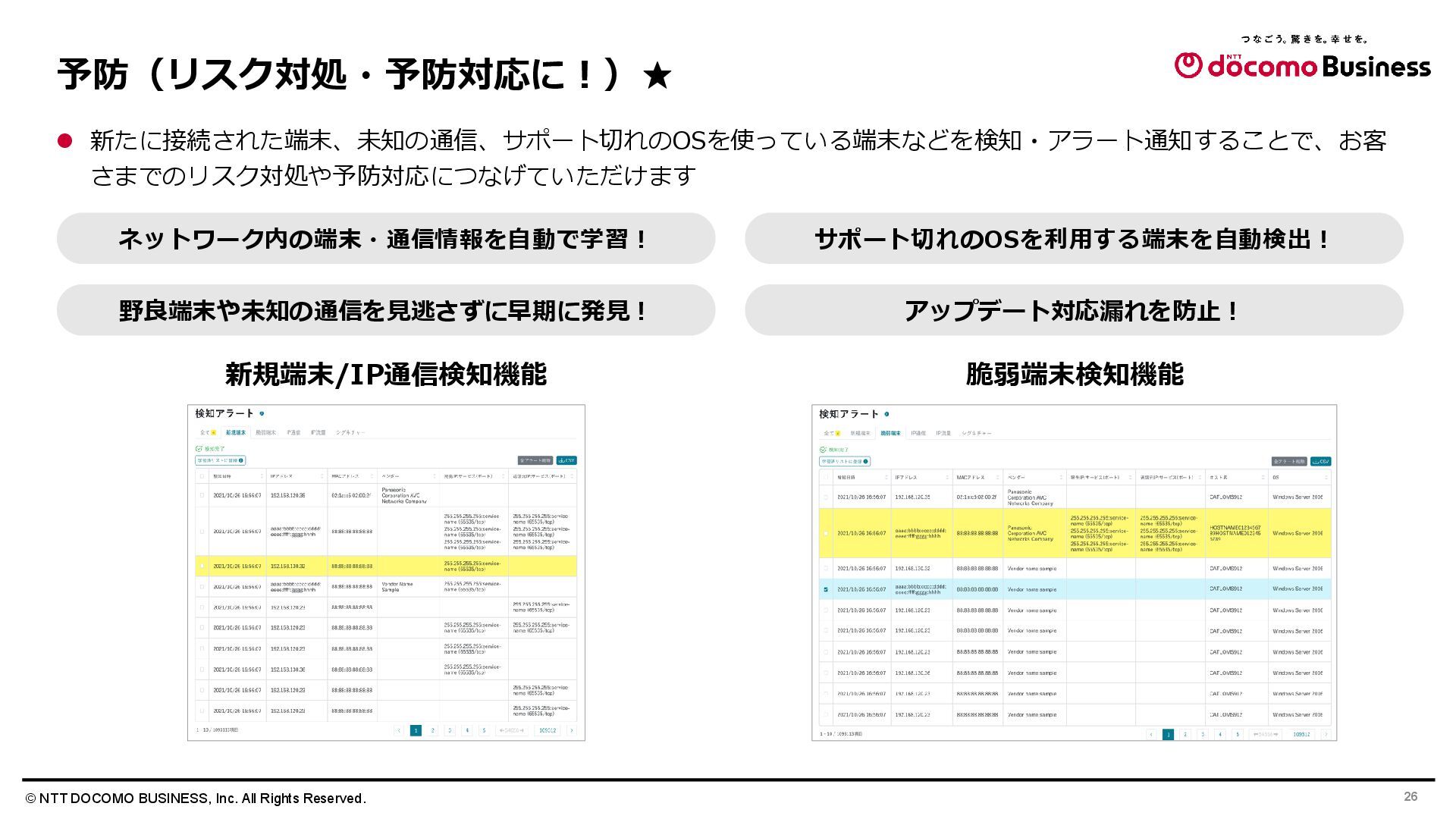 野良端末や未知の通信を見逃さずに早期に発見! 新規端末/IP通信検知機能 サポート切れのOSを利用する端末を自動検出! アップデート対応漏れを防止! 脆弱端末検知機能 ⚫ 新たに接続された端末、未知の通信、サポート切れのOSを使っている端末などを検知・アラート通知することで、お客 さまでのリスク対処や予防対応につなげていただけます 予防(リスク対処・予防対応に!)★