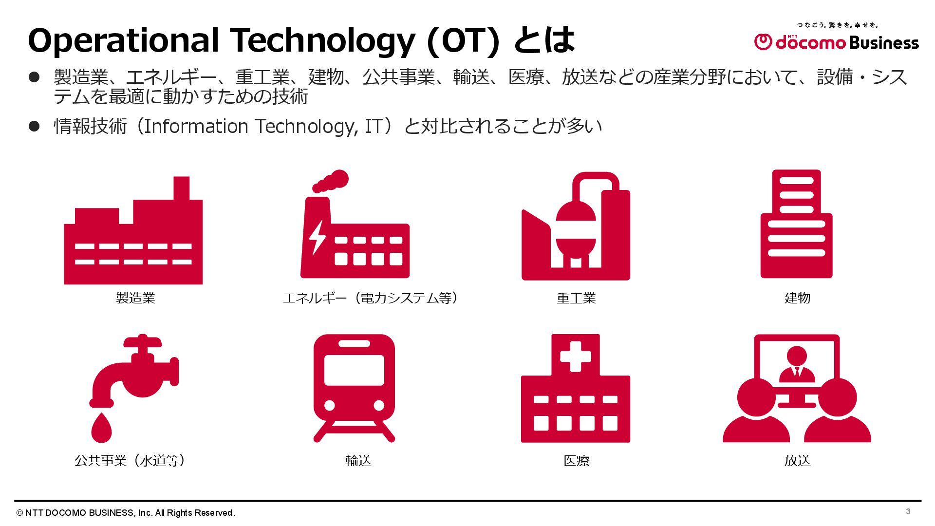 Technology (OT) とは ⚫ 製造業、エネルギー、重工業、建物、公共事業、輸送、医療、放送などの産業分野において、設備・シス テムを最適に動かすための技術 ⚫ 情報技術(Information Technology, IT)と対比されることが多い 製造業 エネルギー(電力システム等) 重工業 建物 公共事業(水道等) 輸送 医療 放送