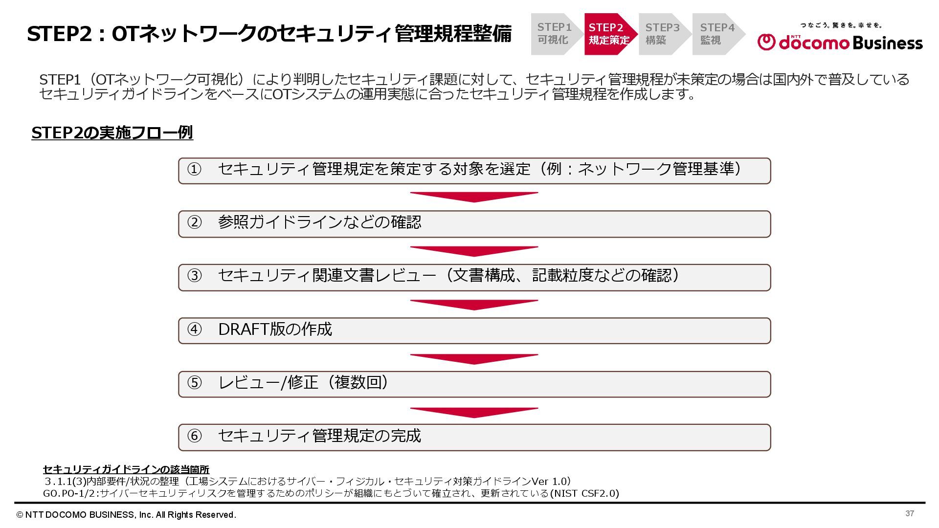 32. © NTT DOCOMO BUSINESS, Inc. All Rights Reserved. 37 STEP1(OTネットワーク可視化)により判明したセキュリティ課題に対して、セキュリティ管理規程が未策定の場合は国内外で普及している