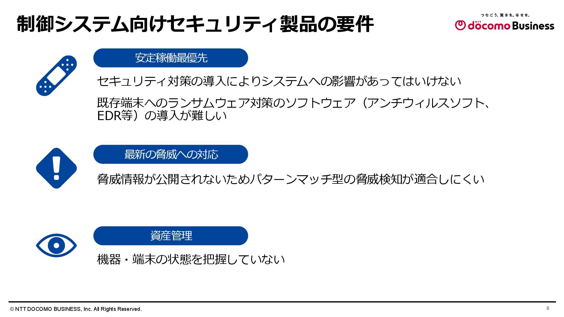 7. © NTT DOCOMO BUSINESS, Inc. All Rights Reserved. 8 制御システム向けセキュリティ製品の要件