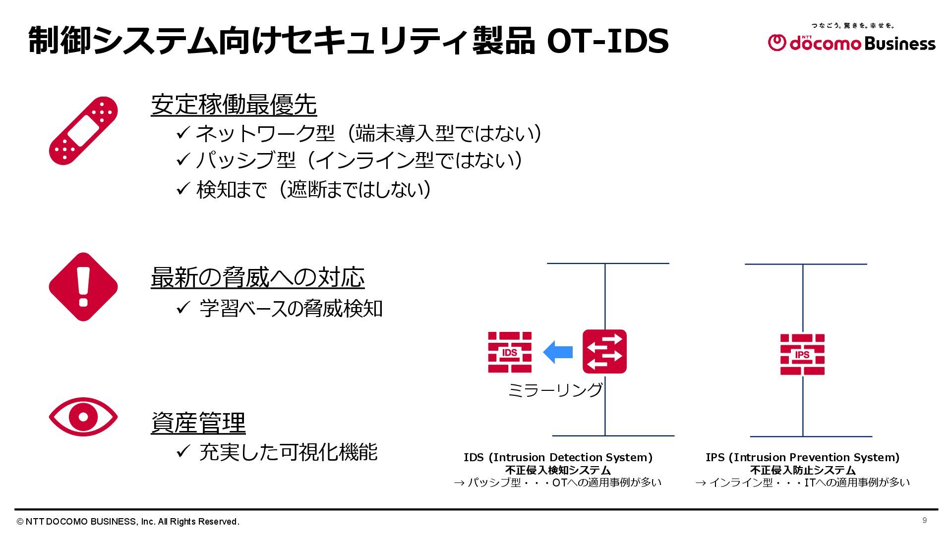 8. © NTT DOCOMO BUSINESS, Inc. All Rights Reserved. 9 制御システム向けセキュリティ製品
