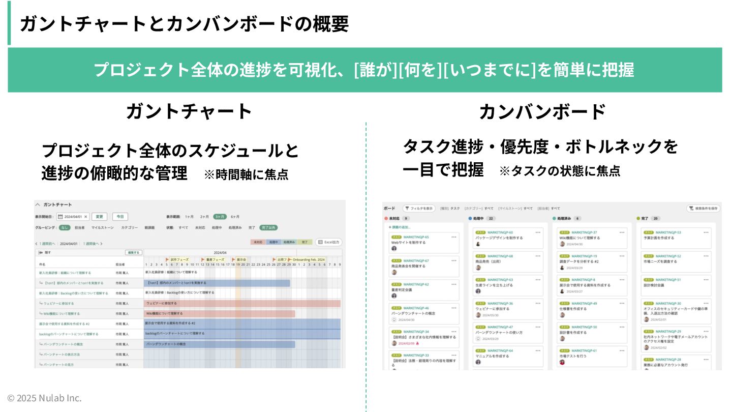 © 2025 Nulab Inc. ガントチャートとカンバンボードの概要 プロジェクト全体の進捗を可視化、[誰が][何を][いつまでに]を簡単に把握 ガントチャート カンバンボード プロジェクト全体のスケジュールと 進捗の俯瞰的な管理 ※時間軸に焦点