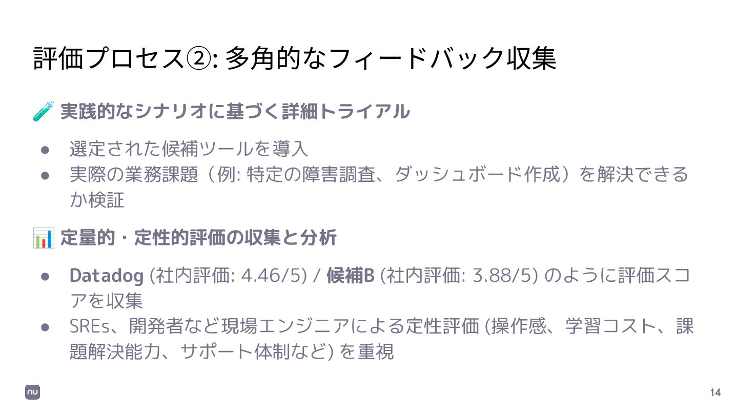 か検証 📊 定量的・定性的評価の収集と分析 • Datadog (社内評価: 4.46/5) / 候補B (社内評価: 3.88/5) のように評価スコ アを収集 • SREs、開発者など現場エンジニアによる定性評価 (操作感、学習コスト、課 題解決能力、サポート体制など) を重視