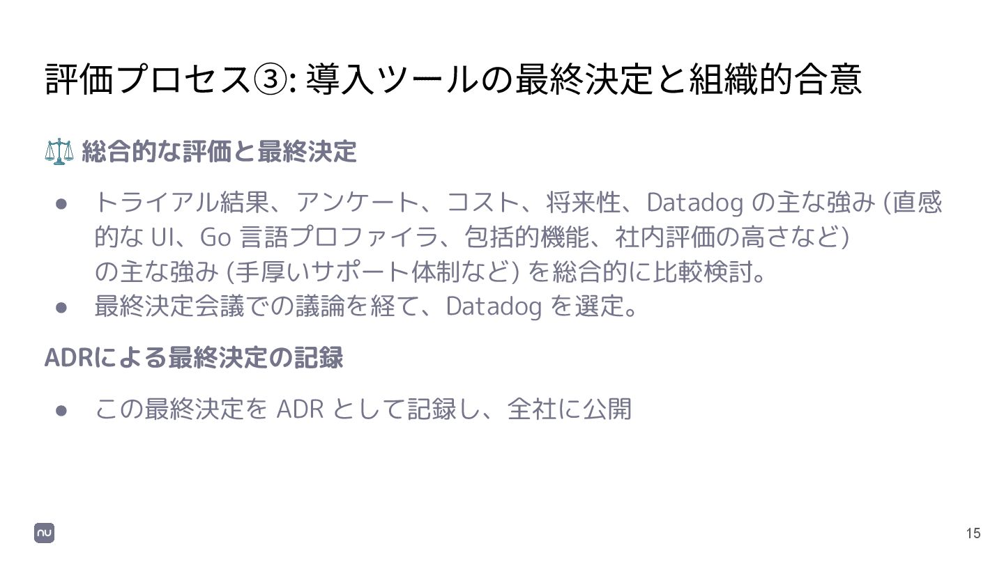 UI、Go 言語プロファイラ、包括的機能、社内評価の高さなど)、候補 B の主な強み (手厚いサポート体制など) を総合的に比較検討。 • 最終決定会議での議論を経て、Datadog を選定。 ADRによる最終決定の記録 • この最終決定を ADR として記録し、全社に公開
