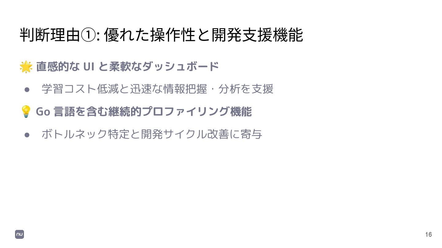 15 評価プロセス③: 導⼊ツールの最終決定と組織的合意 ⚖ 総合的な評価と最終決定 • トライアル結果、アンケート、コスト、将来性、Datadog の主な強み (直感 的な