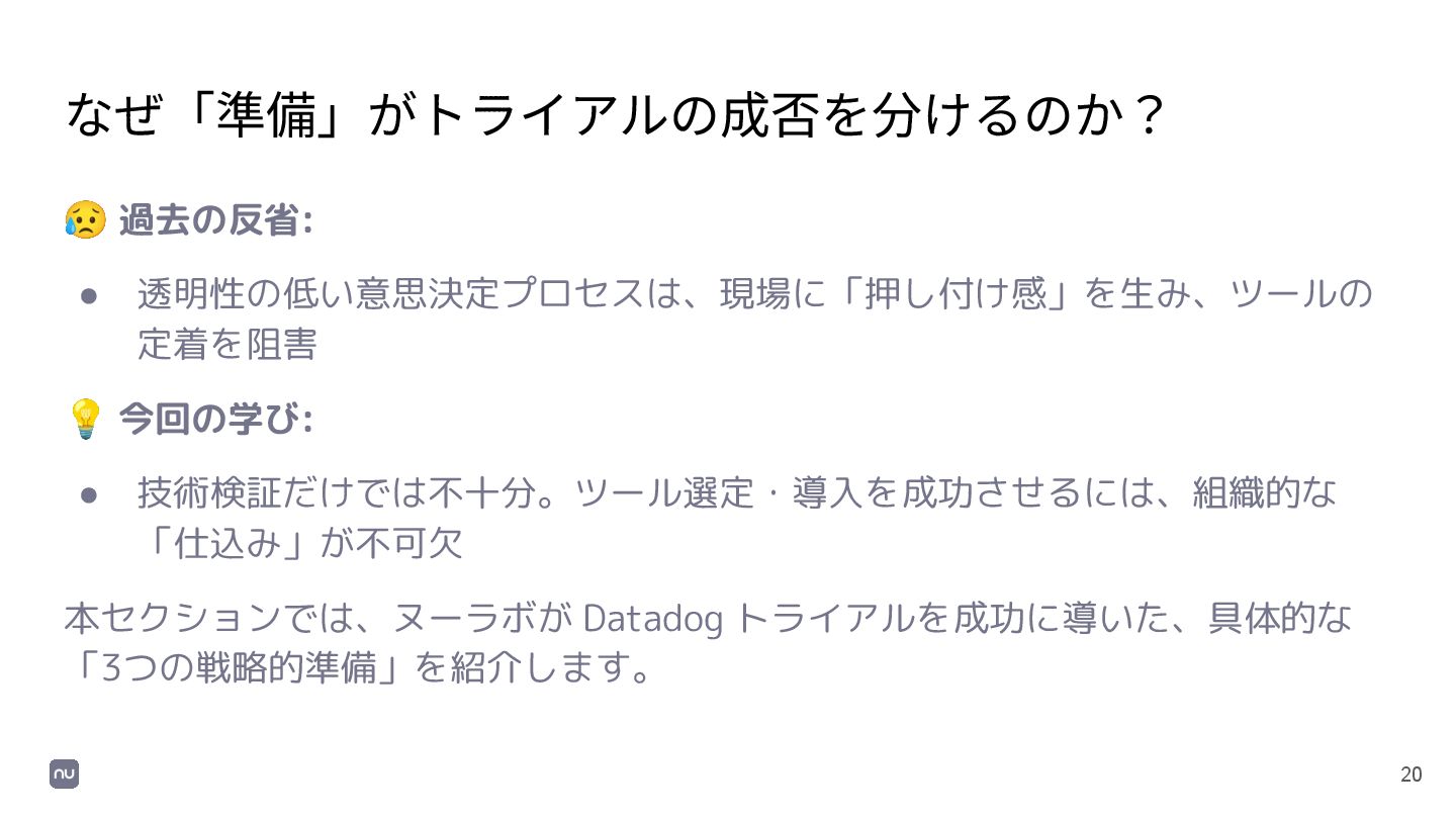 技術検証だけでは不十分。ツール選定・導入を成功させるには、組織的な 「仕込み」が不可欠 本セクションでは、ヌーラボが Datadog トライアルを成功に導いた、具体的な 「3つの戦略的準備」を紹介します。
