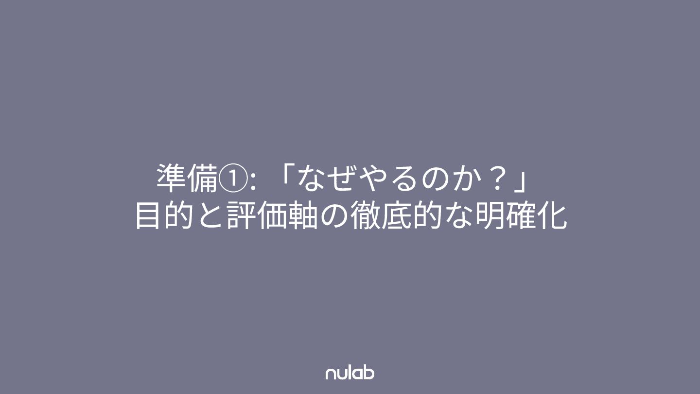 準備①: 「なぜやるのか?」 ⽬的と評価軸の徹底的な明確化