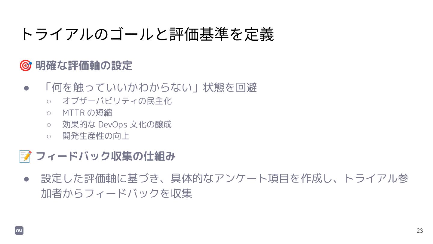 23 トライアルのゴールと評価基準を定義 🎯 明確な評価軸の設定 • 「何を触っていいかわからない」状態を回避 ◦ オブザーバビリティの民主化 ◦ MTTR