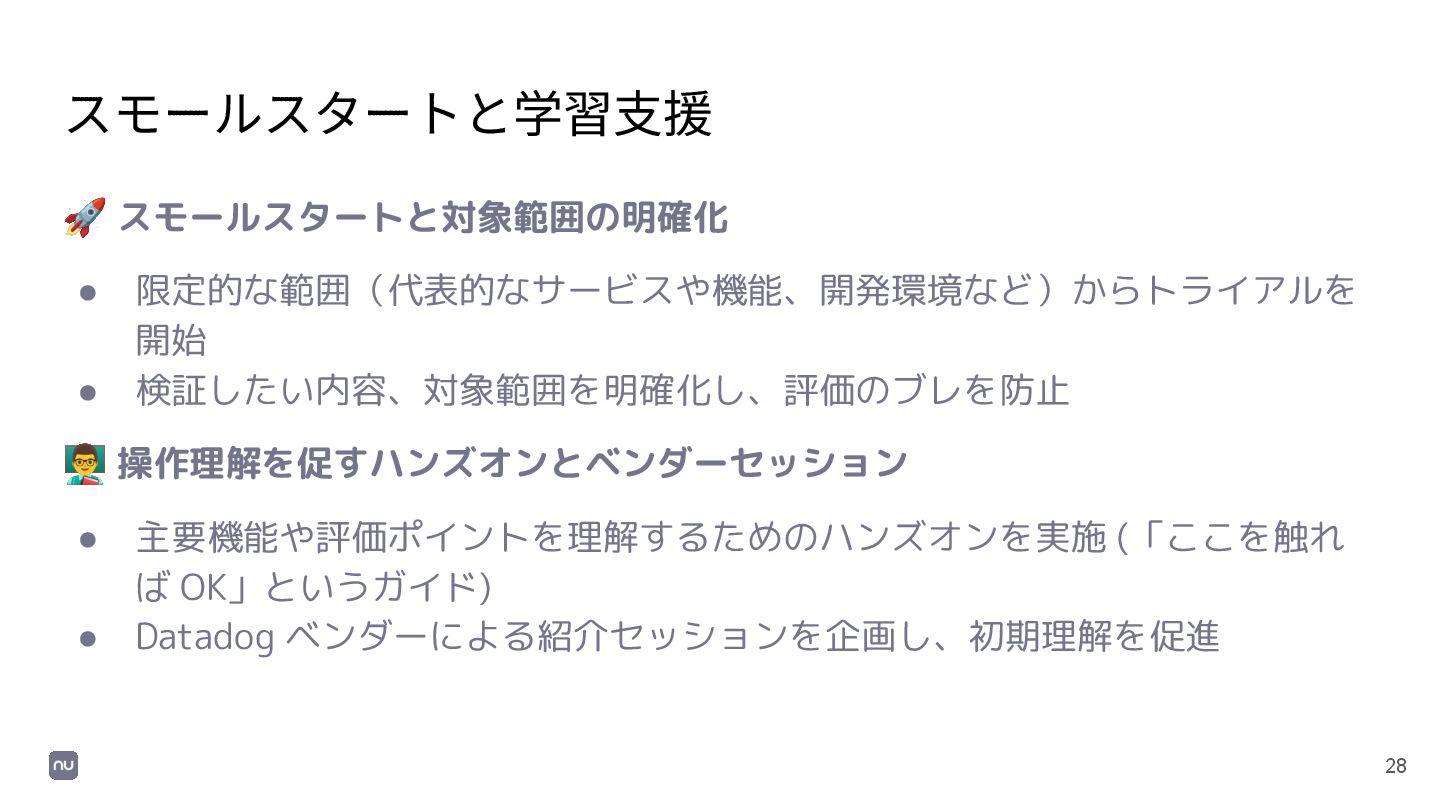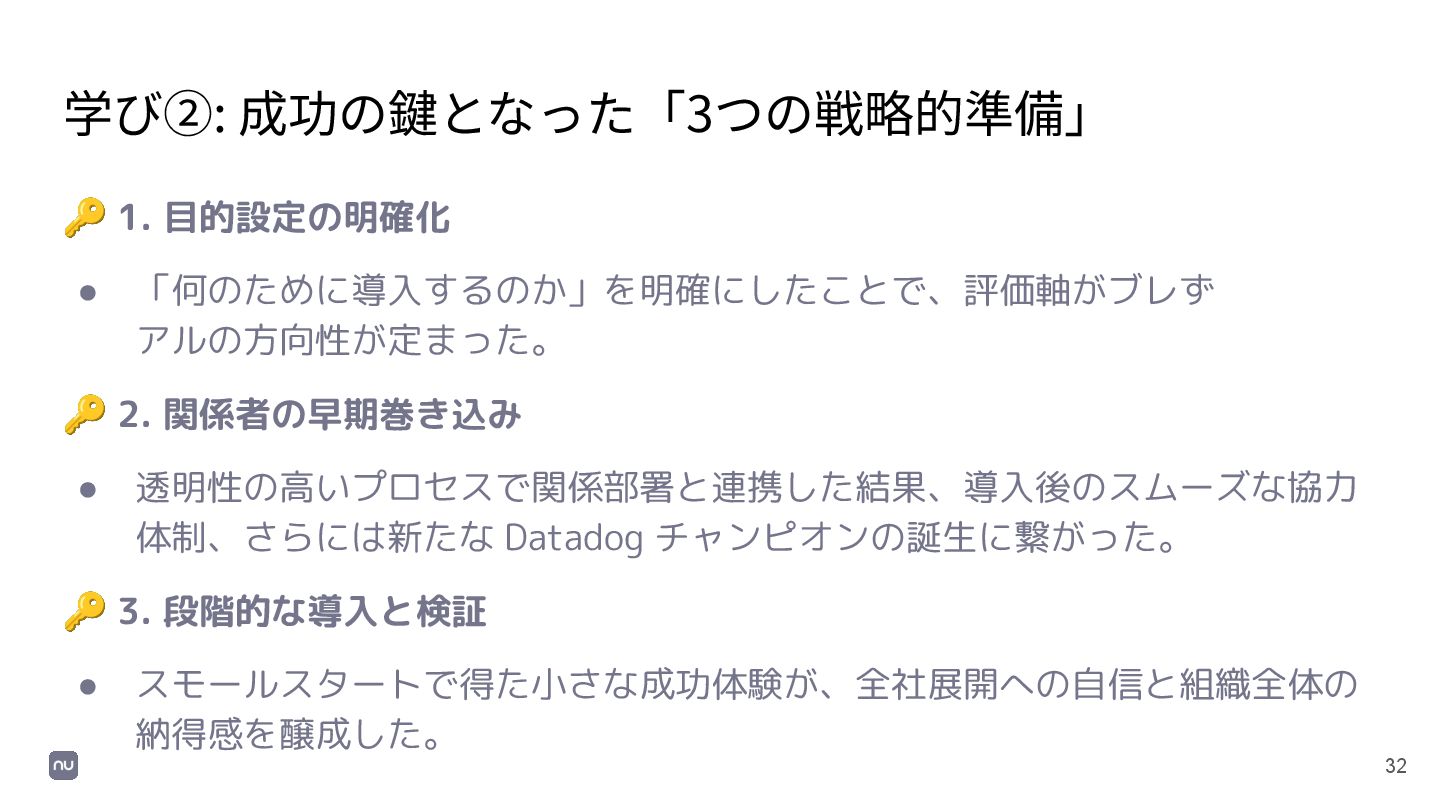 2. 関係者の早期巻き込み • 透明性の高いプロセスで関係部署と連携した結果、導入後のスムーズな協力 体制、さらには新たな Datadog チャンピオンの誕生に繋がった。 🔑 3. 段階的な導入と検証 • スモールスタートで得た小さな成功体験が、全社展開への自信と組織全体の 納得感を醸成した。