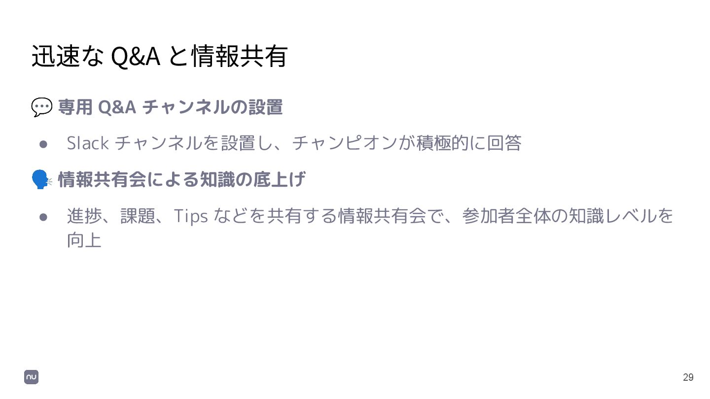 チャンネルを設置し、チャンピオンが積極的に回答 🗣 情報共有会による知識の底上げ • 進捗、課題、Tips などを共有する情報共有会で、参加者全体の知識レベルを 向上