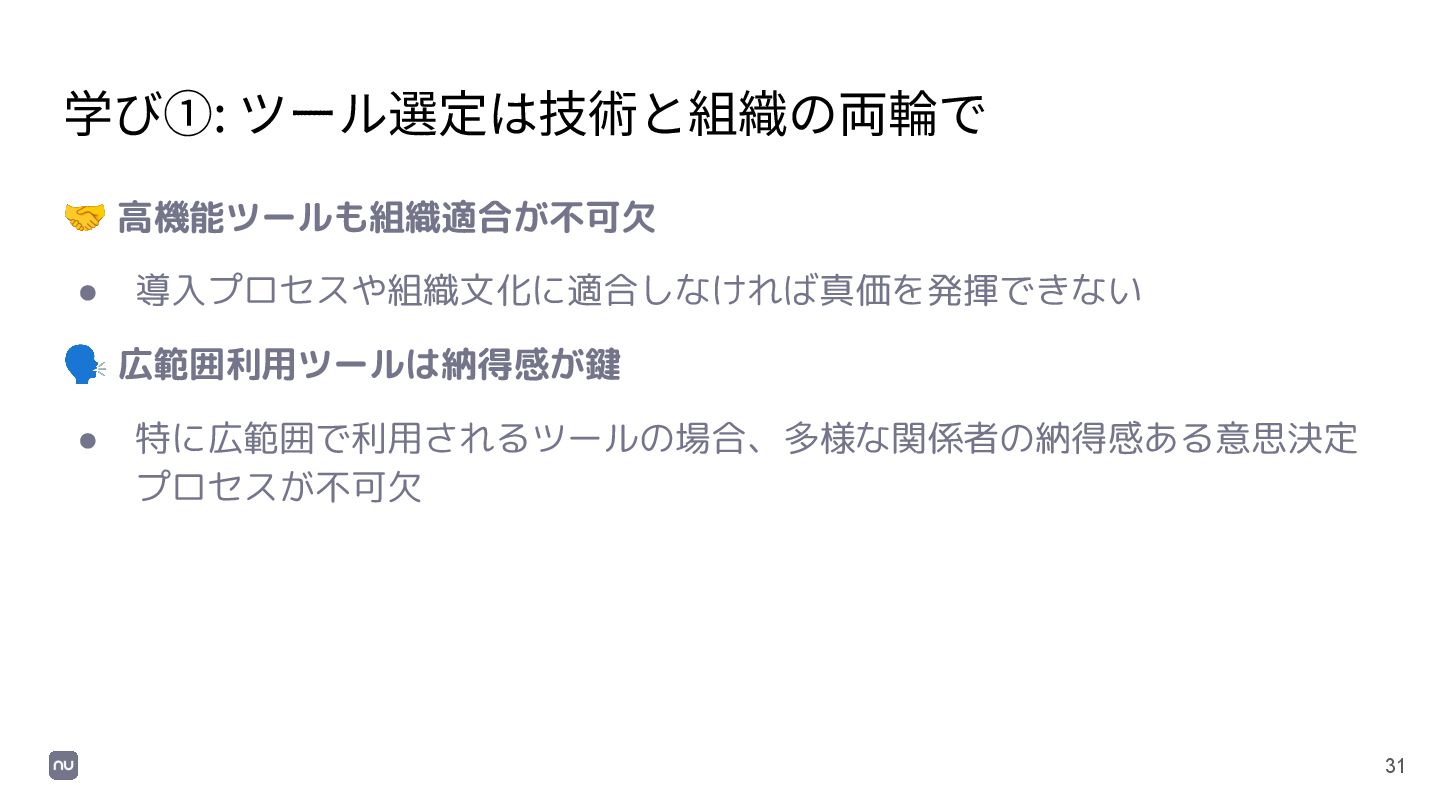 31 学び①: ツール選定は技術と組織の両輪で 🤝 高機能ツールも組織適合が不可欠 • 導入プロセスや組織文化に適合しなければ真価を発揮できない 🗣 広範囲利用ツールは納得感が鍵 •