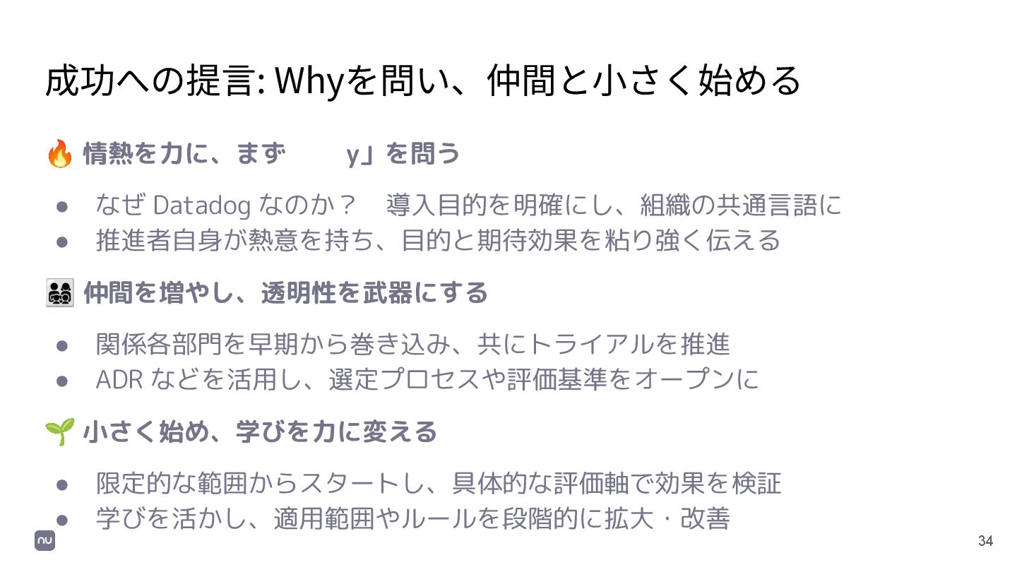 34 成功への提⾔: Whyを問い、仲間と⼩さく始める 🔥 情熱を力に、まず「Why」を問う • なぜ Datadog なのか? 導入目的を明確にし、組織の共通言語に •