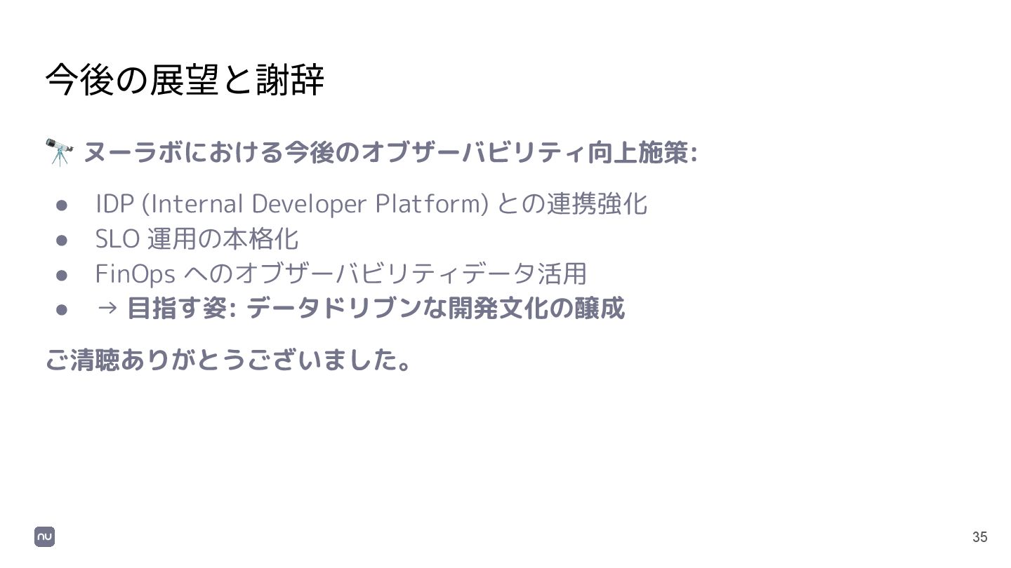 35 今後の展望と謝辞 🔭 ヌーラボにおける今後のオブザーバビリティ向上施策: • IDP (Internal Developer Platform) との連携強化