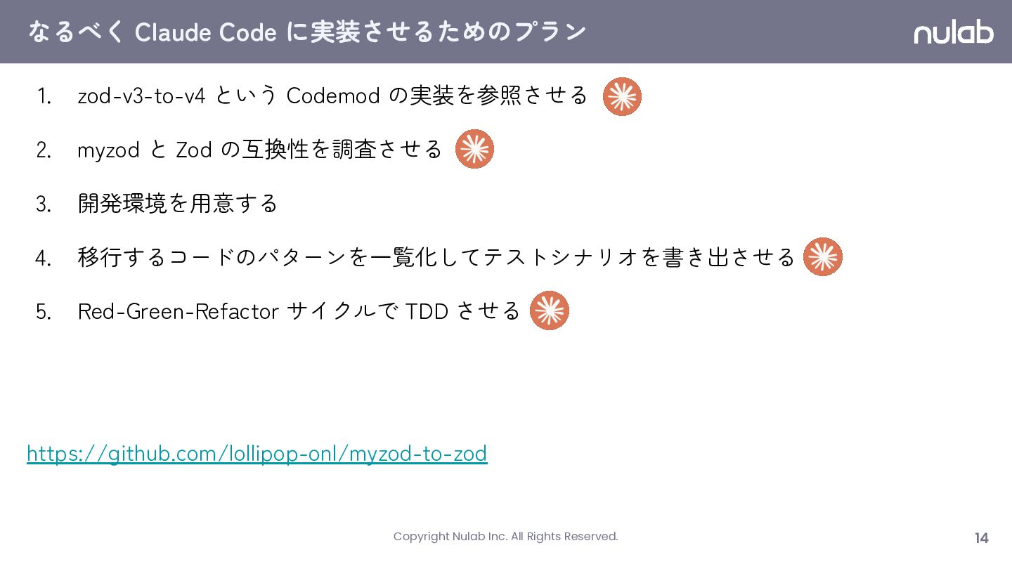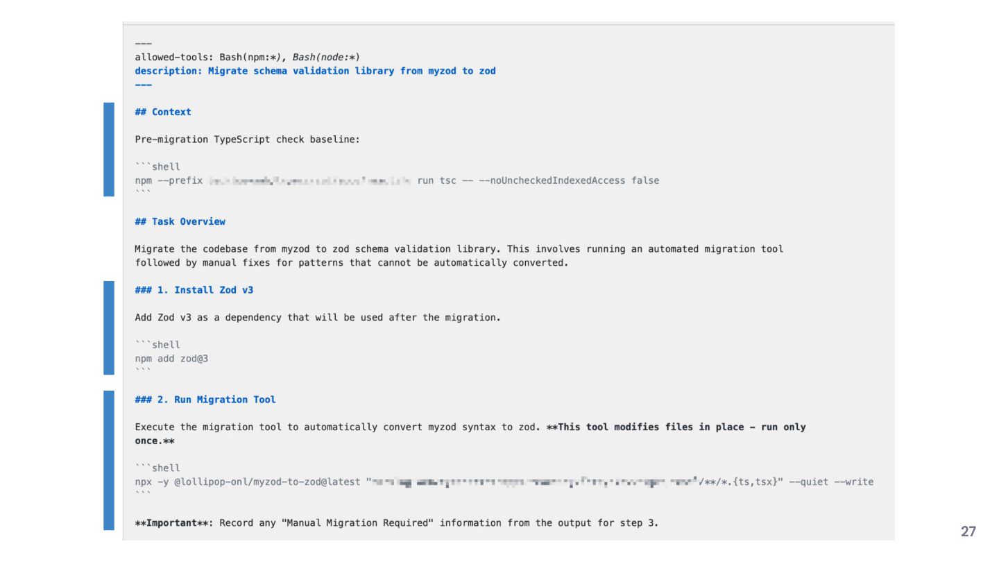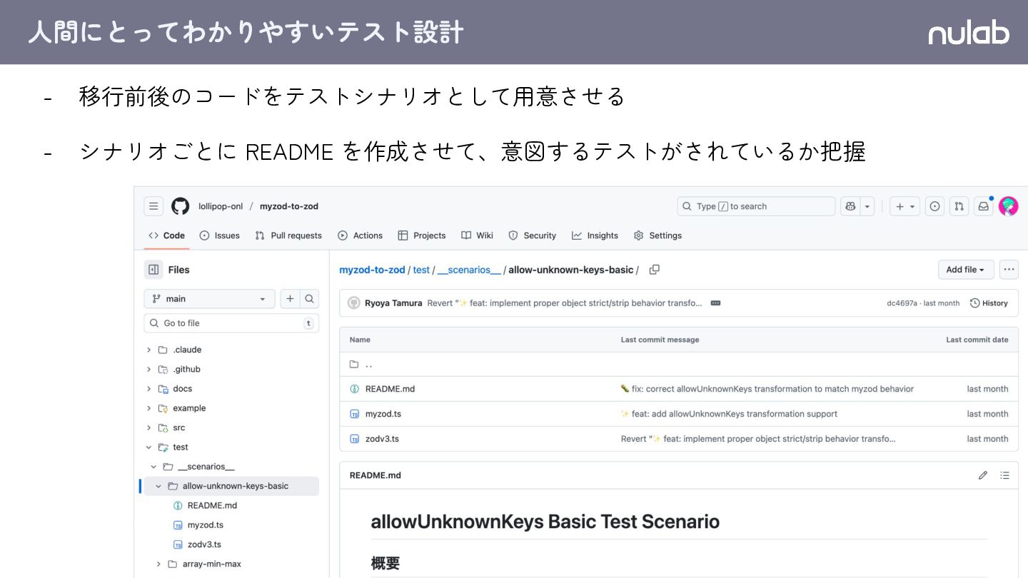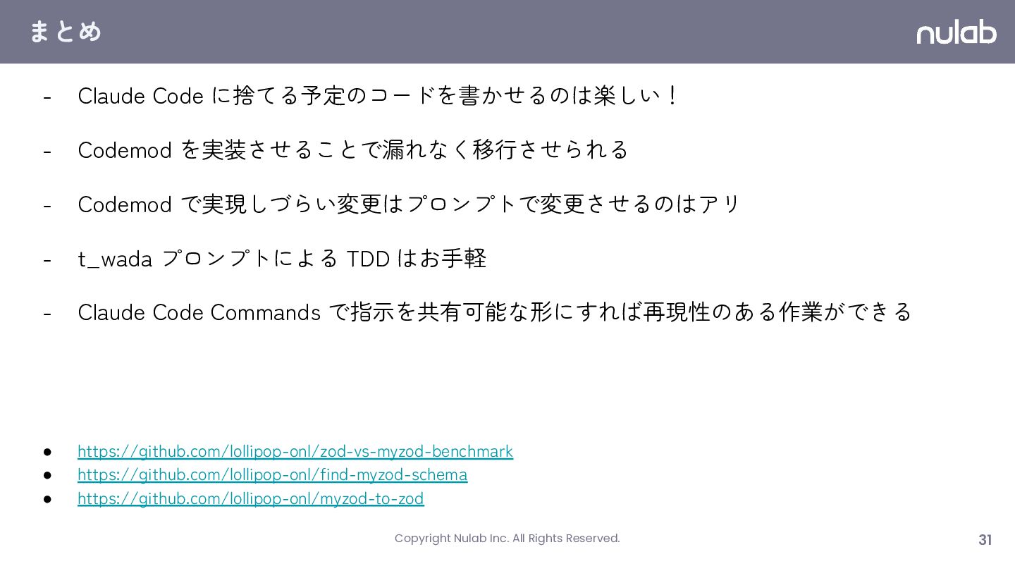 Code に捨てる予定のコードを書かせるのは楽しい! - Codemod を実装させることで漏れなく移行させられる - Codemod で実現しづらい変更はプロンプトで変更させるのはアリ - t_wada プロンプトによる TDD はお手軽 - Claude Code Commands で指示を共有可能な形にすれば再現性のある作業ができる • https://github.com/lollipop-onl/zod-vs-myzod-benchmark • https://github.com/lollipop-onl/find-myzod-schema • https://github.com/lollipop-onl/myzod-to-zod